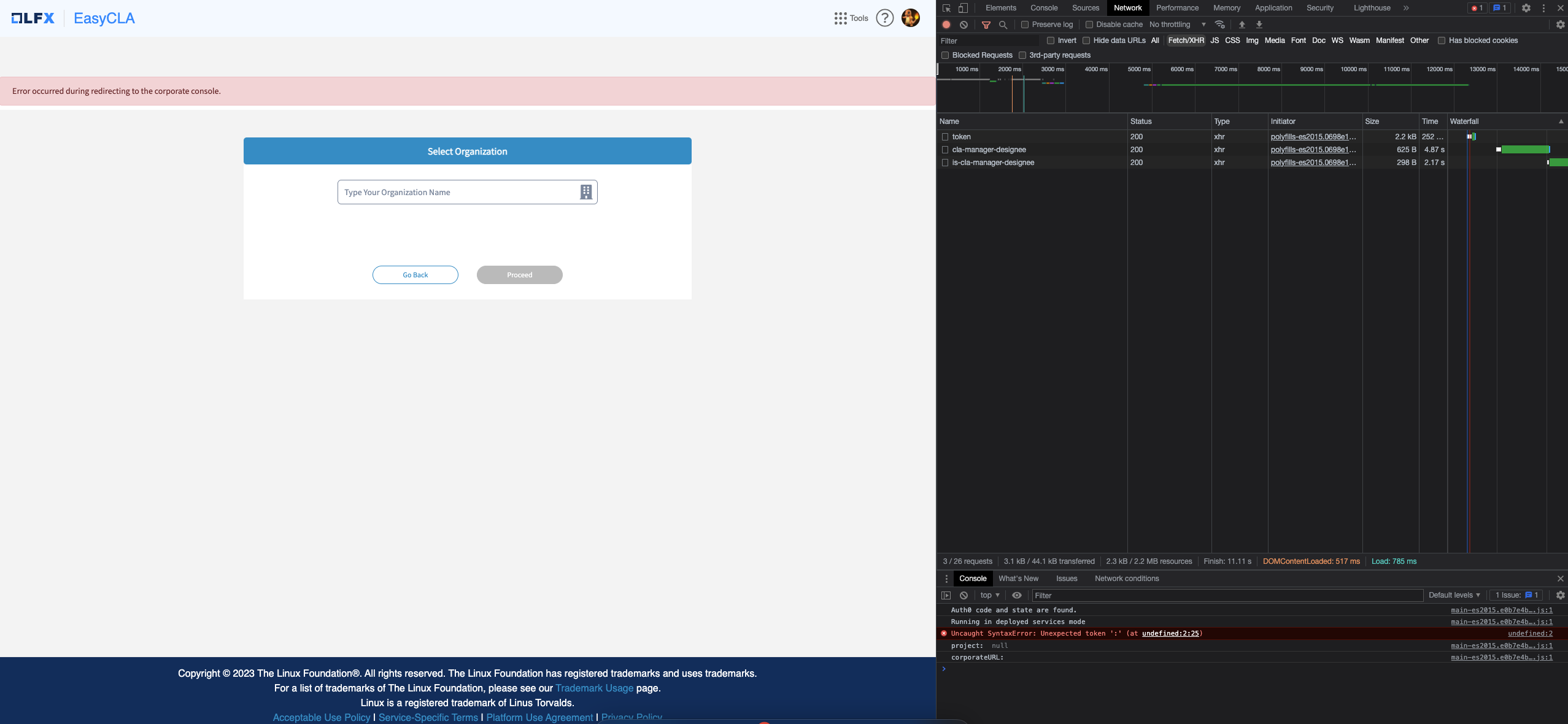 Contributor for CHIPS Alliance CLA Group reported "Redirecting to Corporate Console Error" in the Contributor Console while trying to perform a CCLA.