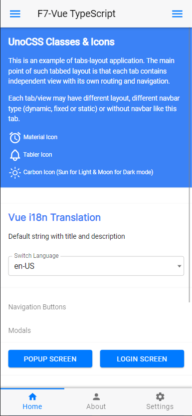 The project structure is a little bit different from the original Framework7 Cli setup and is according to the default Vue 3 structure. It's using pages from Framework7 Tabbed layout, which is the default view for this starter template. Compiled files on build are located in the root dist directory. index.html is also in the root directory.