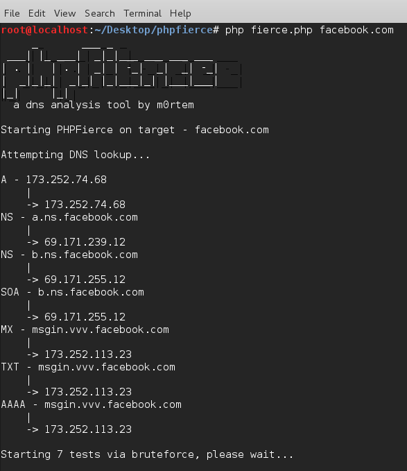 phpfierce A PHP implementation of the famous Perl script Fierce by RSnake How to use php fierce.php example.com subdomainscommon.txt 100 Credits RSnake for fierce.pl, marcushat for RollingCurlX