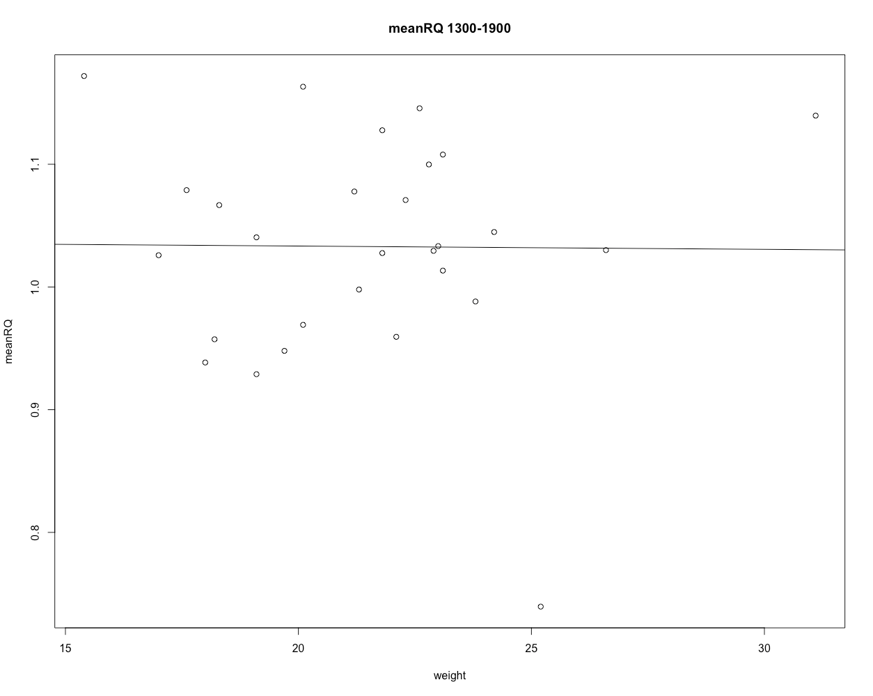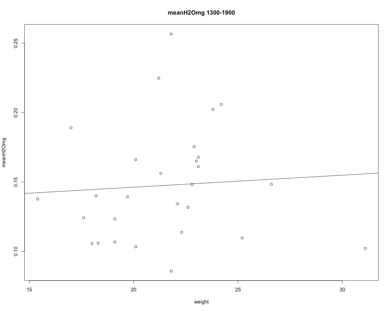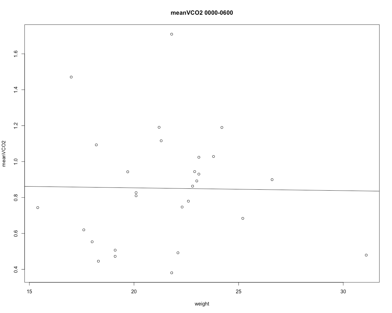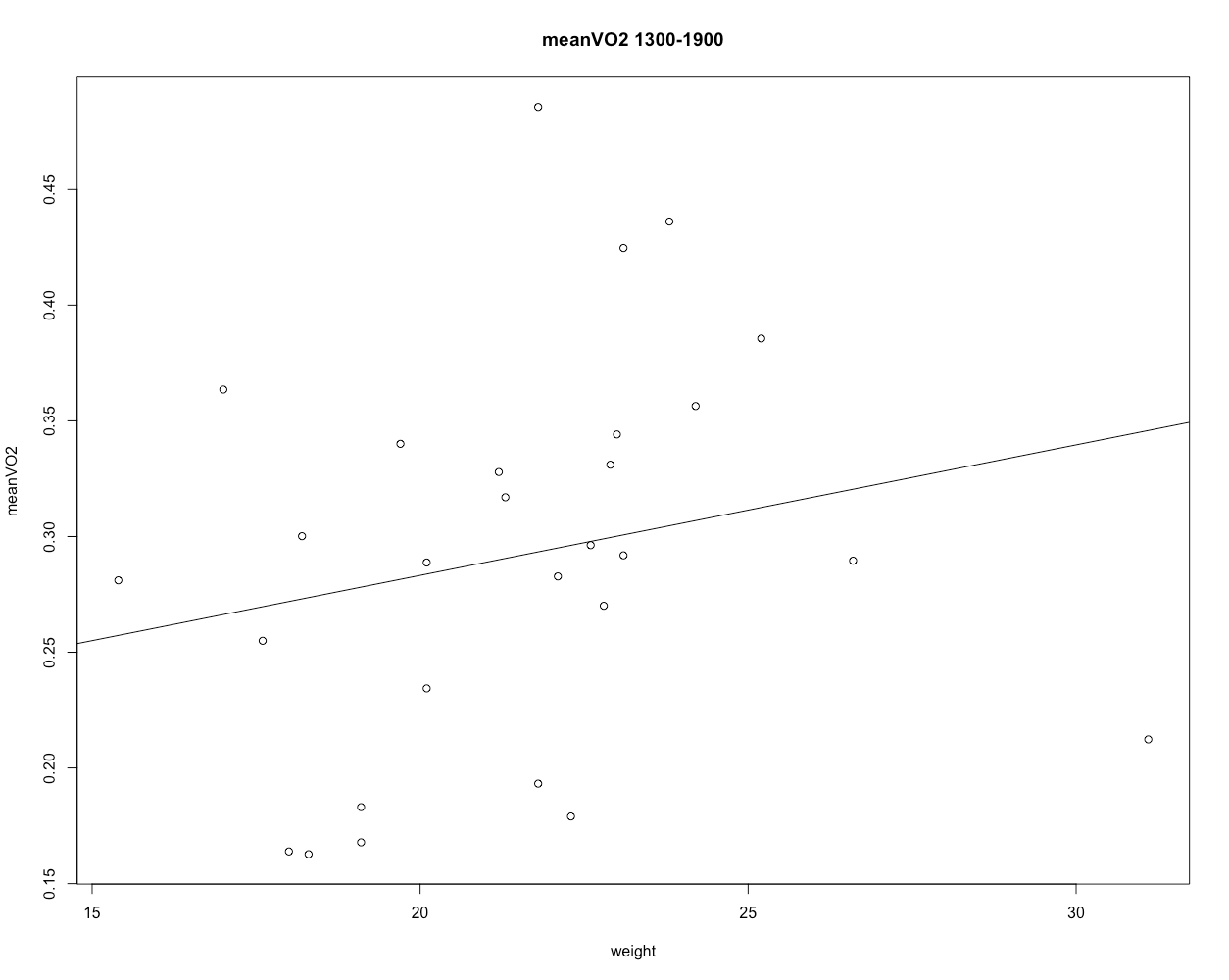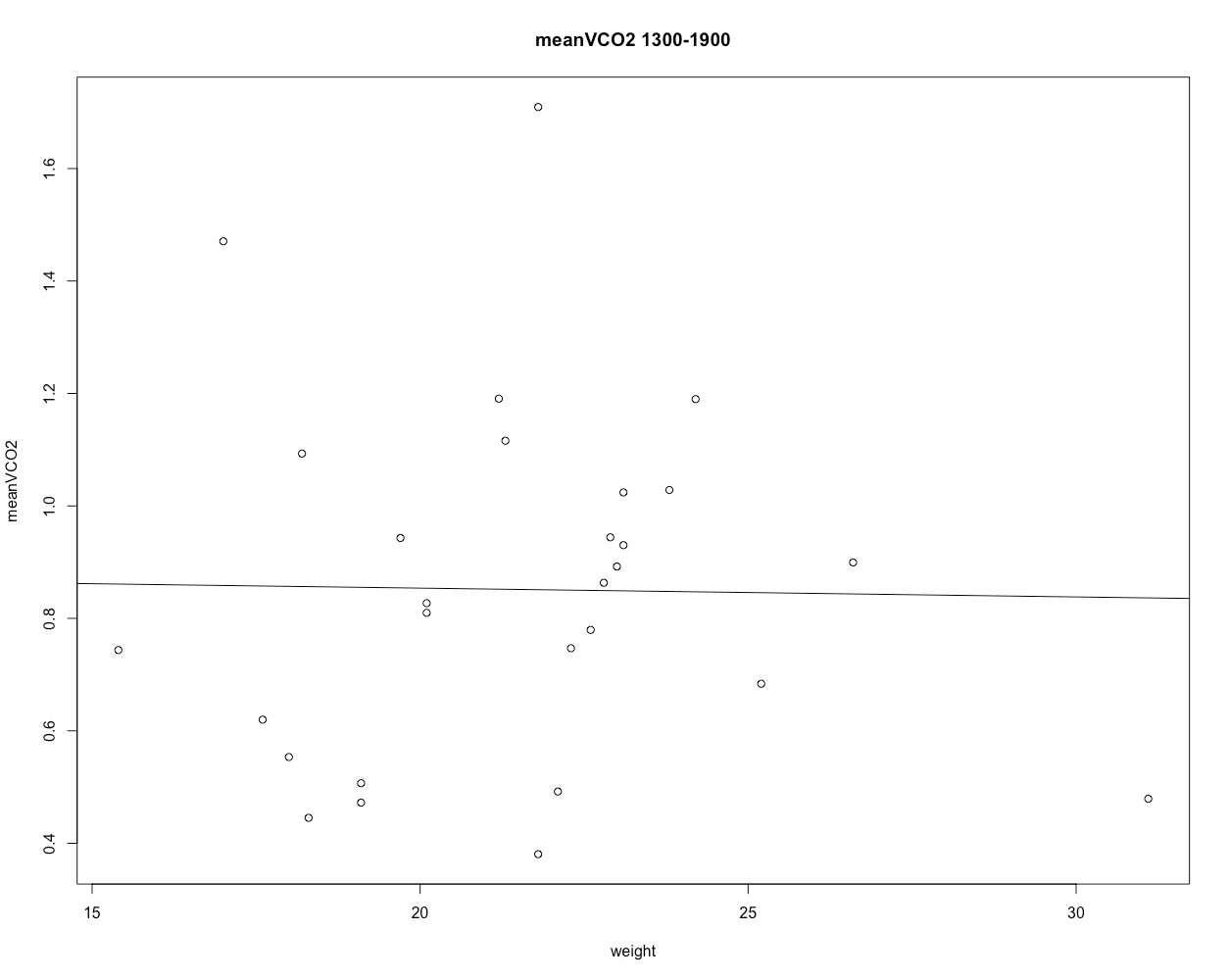 plot(meanVCO2[[1]] ~ animalweight[[1]], main = "meanVCO2 1300-1900", ylab="meanVCO2", xlab="weight")