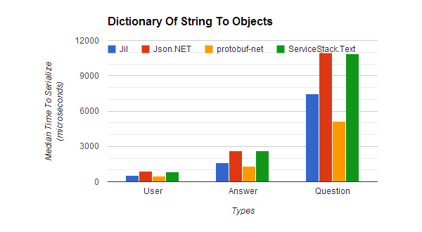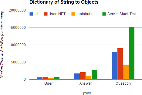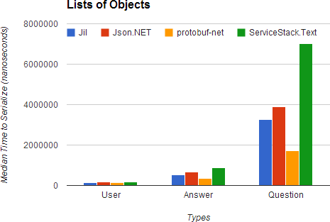 For comparison, here's how Jil stacks up against other popular .NET serializers in a synthetic benchmark: