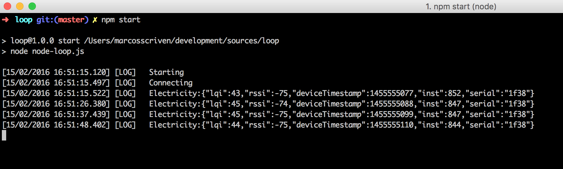 - Edit node-loop.js with your serial/secret