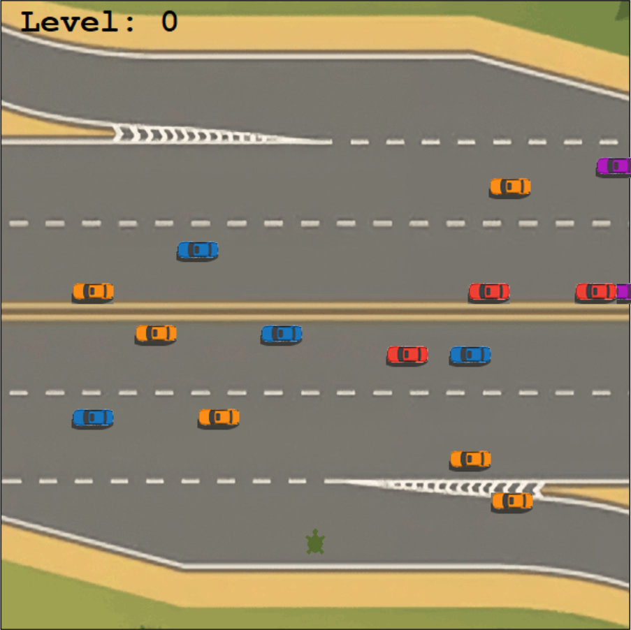 When the turtle hits the top edge of the screen, it moves back to the original position and the player levels up. On the next level, the car speed increases.