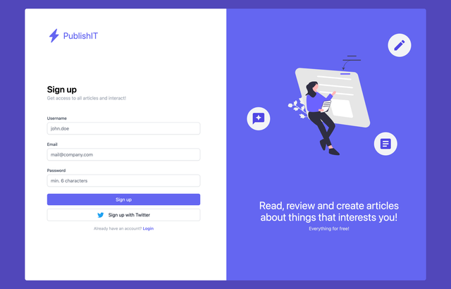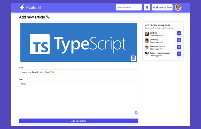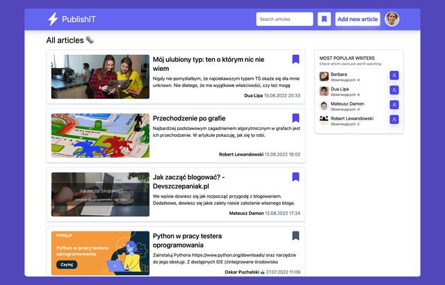PublishIT is a blog app where you can read, write and comment articles about IT. It's mainly inspired by ohmydev.pl. As a user you can: create blog post and attach an image cover to it, comment article and report comments. You can also follow other people and change your profile picture and bio.