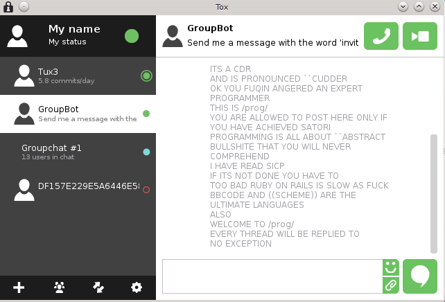 This GUI uses code from @nurupo's ProjectTox-Qt-GUI, in particular the "Core" Toxcore wrapper.
