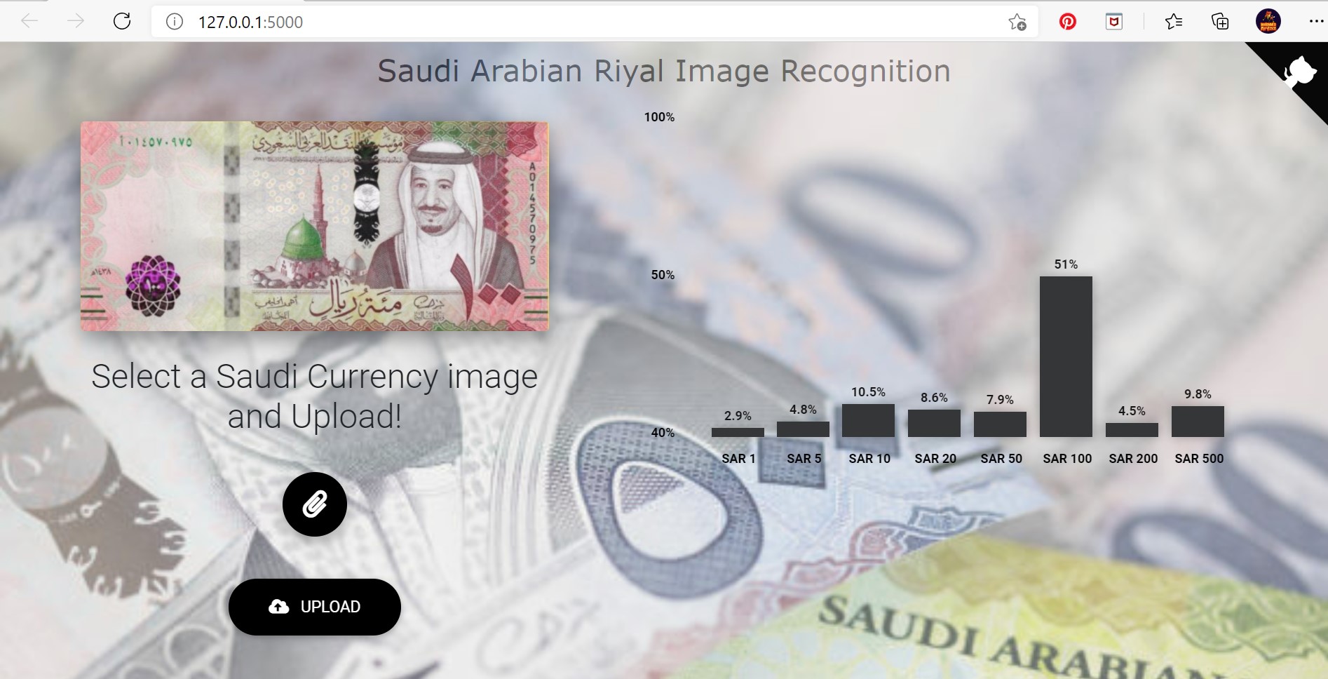 This is a simple image classification Flask app trained on the top of Keras API. The trained CNN model takes an image (Saudi Arabian Riyal) as an input and predict the class of image from 1, 5, 10, 20, 50, 100, 200, 500 denomination.