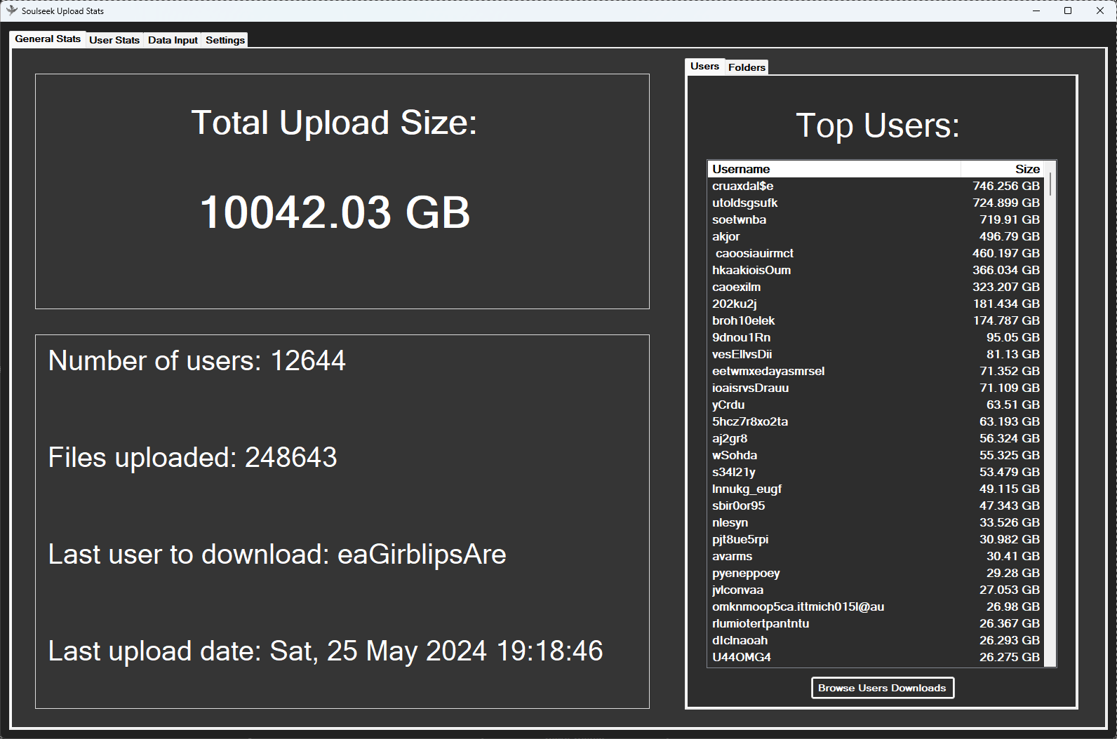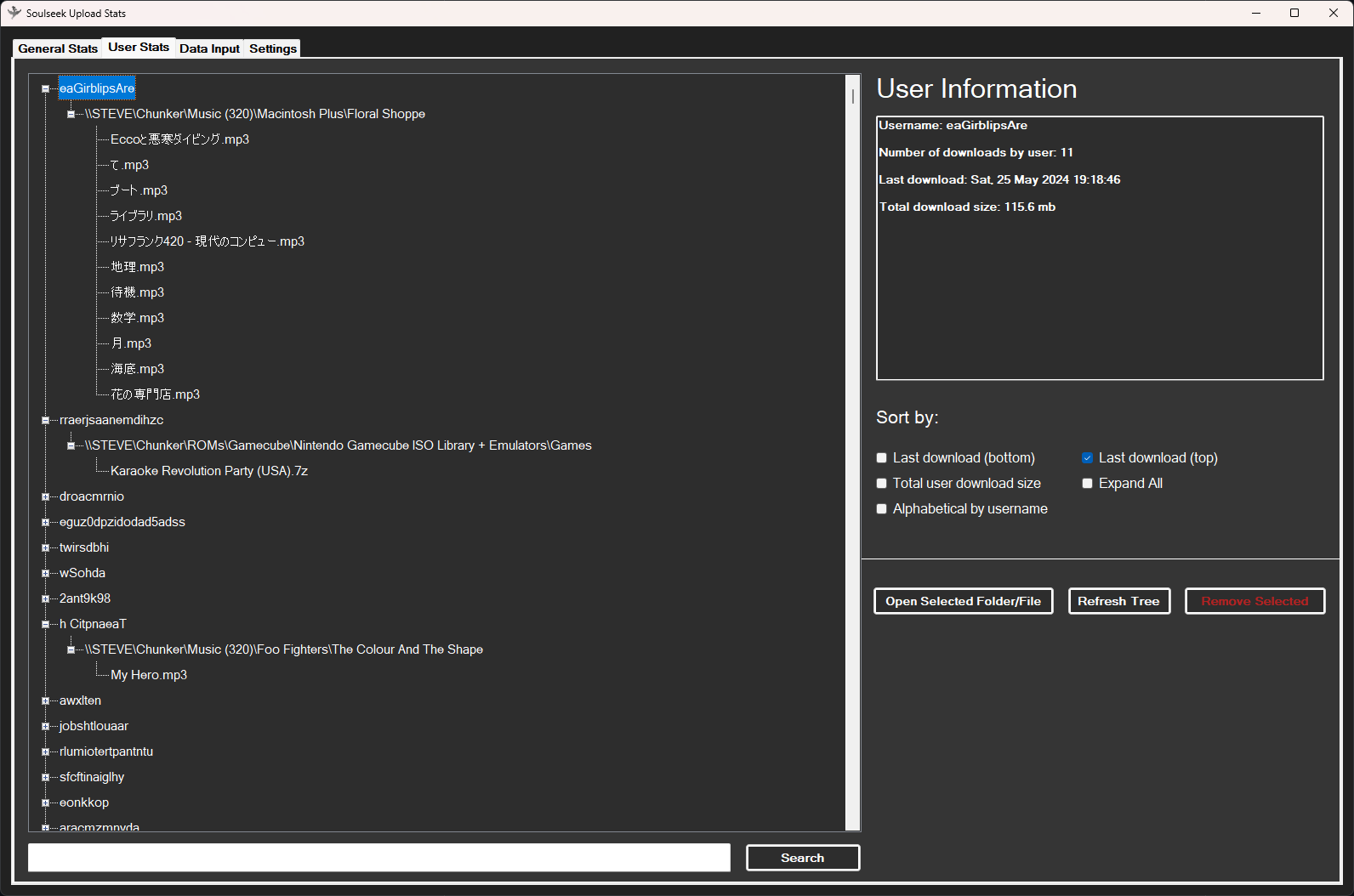From the user stats page you can view all the users who have downloaded from you. For each user the program logs all their downloads and sorts them by folder. There are a few different sorting options and a search bar. The search works on anything in the whole database (username, folder, filename etc). You can remove any item from the database by selecting it and clicking the "Remove Selected" button.