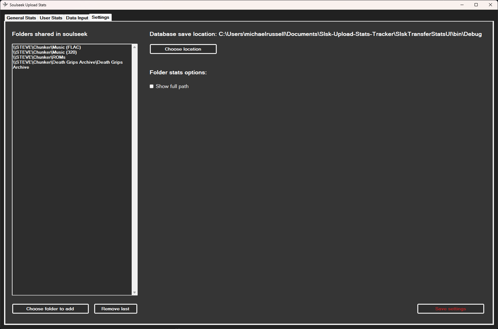 The first thing you need to do when launching the program for the first time is initialize your settings. You need to choose a place to save the database that will be built as well as add the location of all the folders you are sharing in soulseek. Once you have selected your desired save location and added all the same folders that you are sharing in soulseek you can click the "Save settings" button. Here's an example of my settings page.