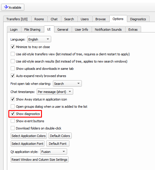 Now for adding some data. You first need to enable "Show diagnostics" in the SoulseekQT settings under "Options" > "UI"