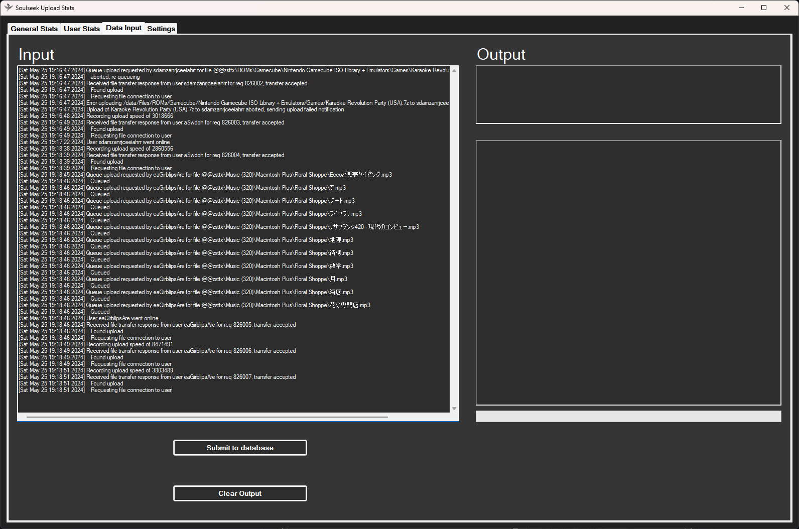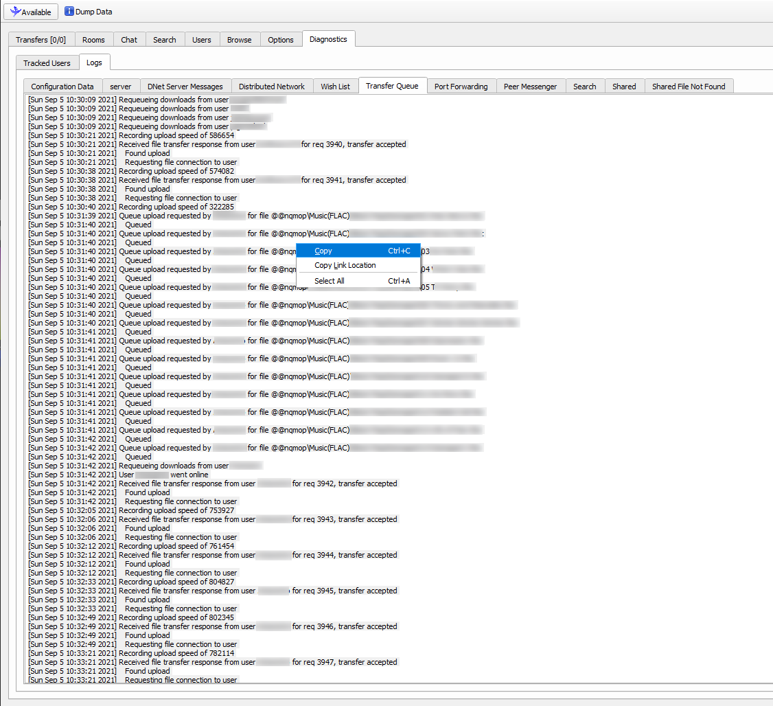 Then you can naviagte to "Diagnostics" > "Logs" > "Transfer Queue". This is where you can copy the data to paste into the stats tracker. NOTE: You will need to copy this data before closing soulseek as the SoulseekQT client does not keep the data after closing. You can also copy the data anytime you have a new upload. The stats tracking program will only gather new data.