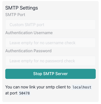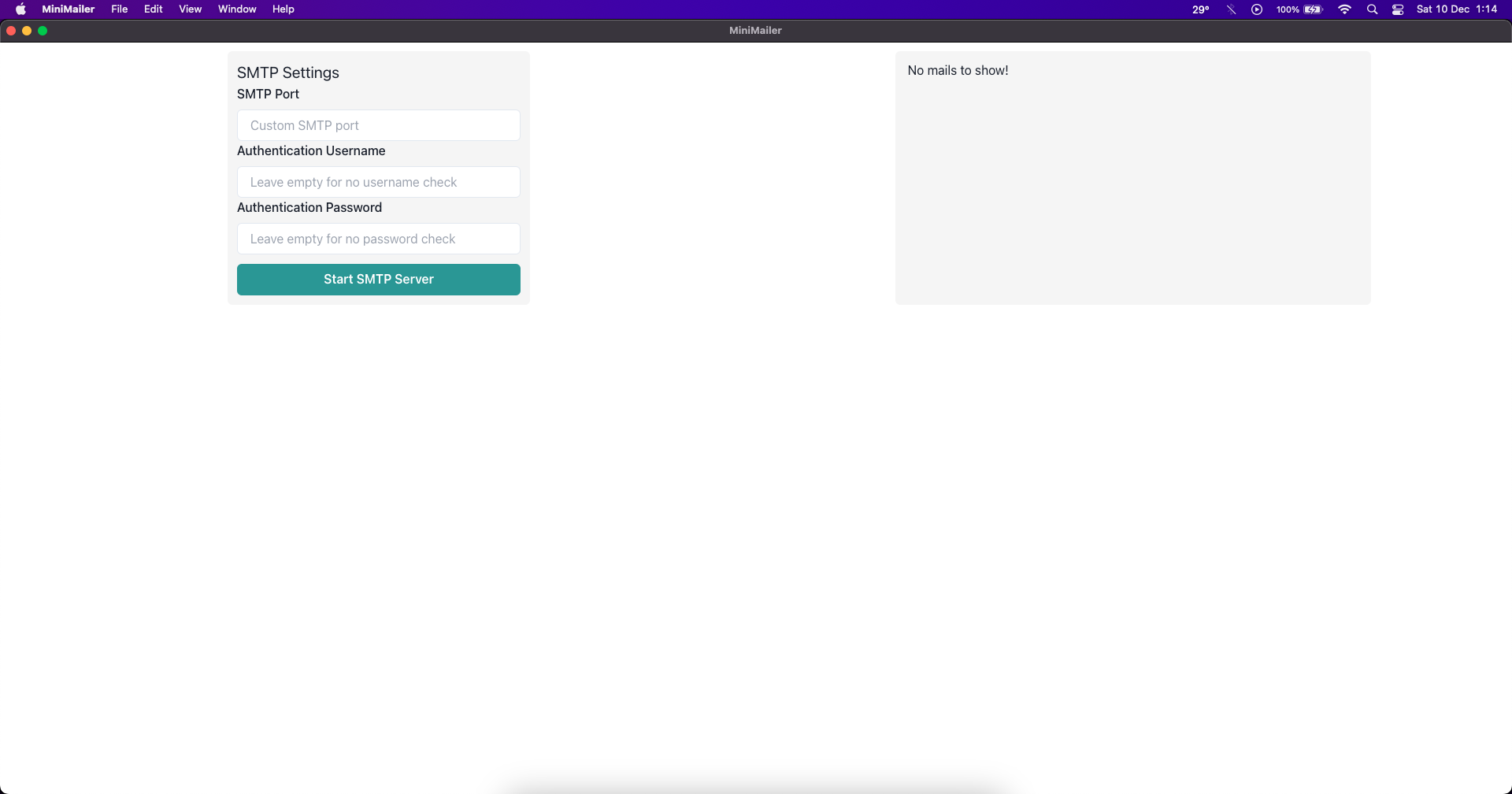 This is a demo release. Meaning the app is not production ready. The app is usable, you are able to start/stop SMTP server by clicking a button. You can also set authentication credentials as well as the port to start the SMTP on. You can also view emails received. The emails are temporary and do not last forever. Emails are lost when the server is stopped.