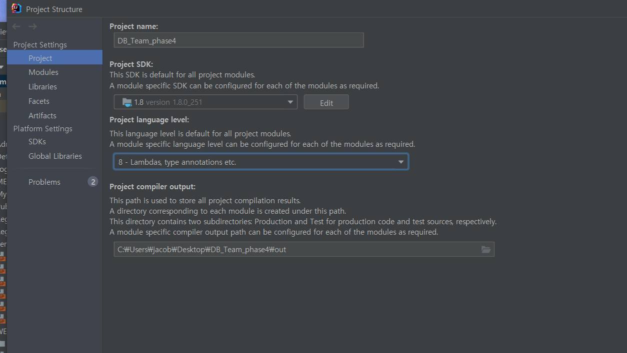 file - project structure - project에서 SDK를 1.8로 language level을 8로 설정