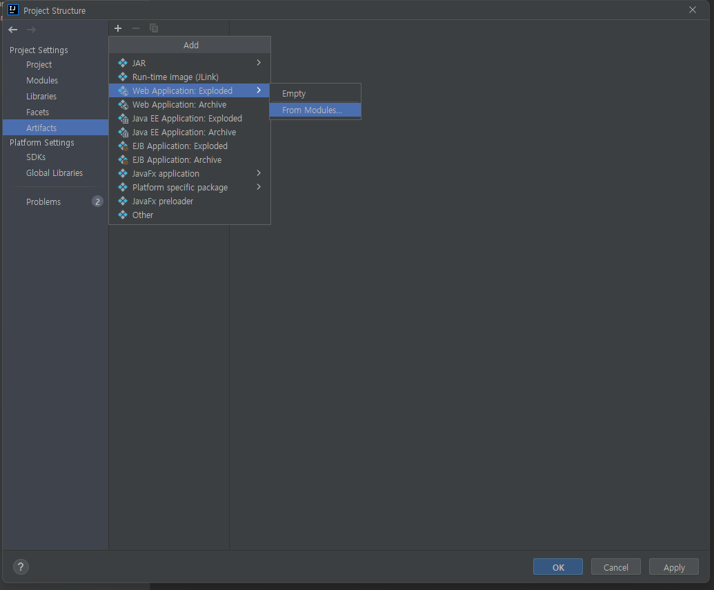 File-Project Structure-Artifact에서 Web Application: Exploed 누르고 From Modules을 클릭합니다