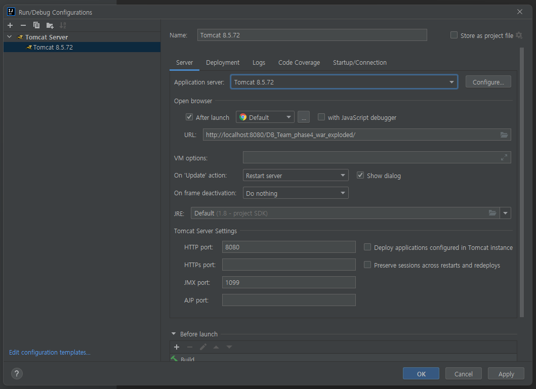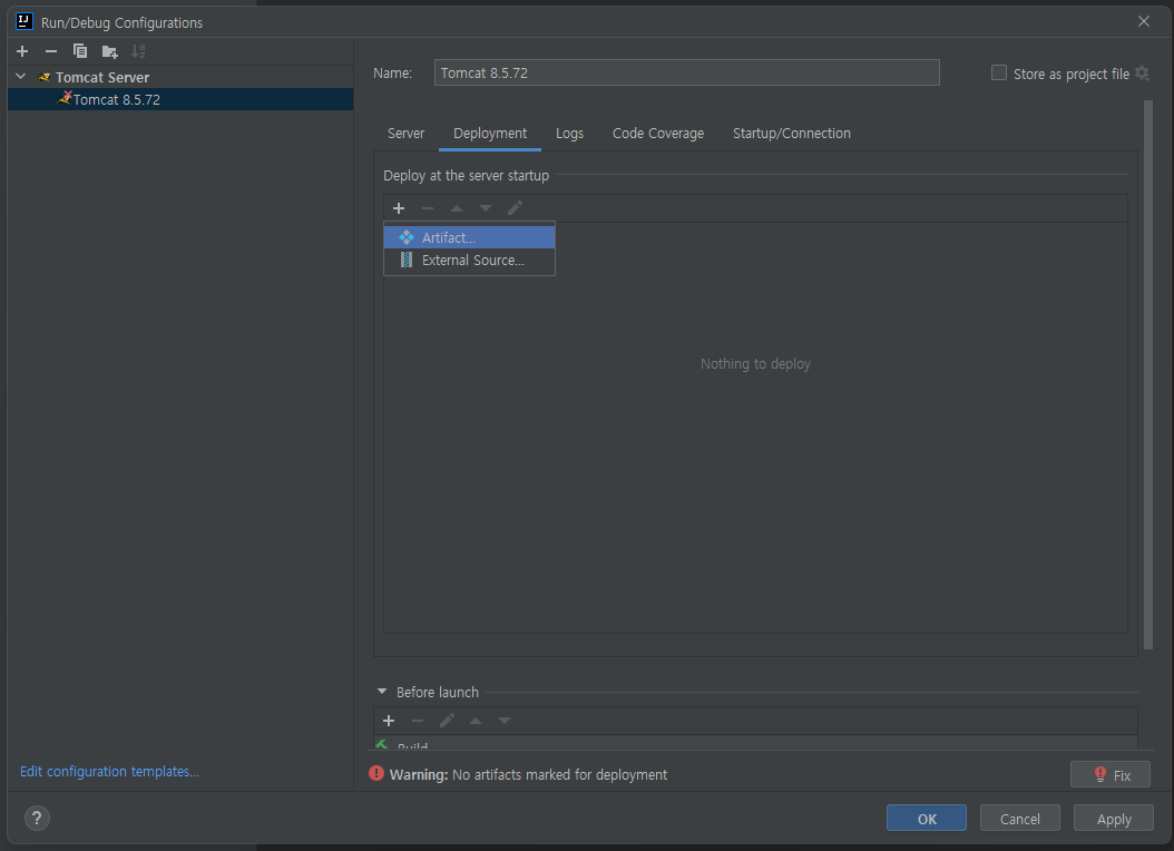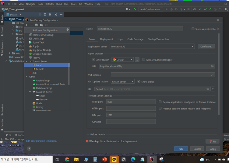 상단 add configuration에서 Add new → Tomcat Server Local을 추가합니다