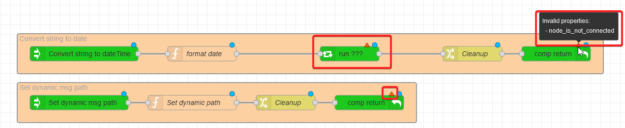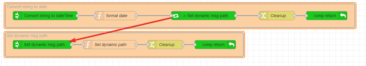 [ { "id": "1172981daf1840f2", "type": "group", "z": "77160189ed03316a", "name": "Convert string to date", "style": { "fill": "#FDD0A2", "label": true }, "nodes": [ "6255b331b23dc415", "f32efb99fc1821f8", "ec4dbc2a6e2a9f01", "bb6cde2ac7adbfd7", "d11f72bee48d3cba" ], "env": [], "x": 54, "y": 359, "w": 1192, "h": 82 }, { "id": "6255b331b23dc415", "type": "component_in", "z": "77160189ed03316a", "g": "1172981daf1840f2", "name": "Convert string to dateTime", "api": [ { "name": "date", "type": "string", "required": true, "contextOption": true }, { "name": "format", "type": "string", "required": true, "contextOption": true }, { "name": "outputPath", "type": "string", "required": true, "contextOption": true } ], "usecontext": true, "x": 190, "y": 400, "wires": [ [ "ec4dbc2a6e2a9f01" ] ] }, { "id": "f32efb99fc1821f8", "type": "component_out", "z": "77160189ed03316a", "g": "1172981daf1840f2", "name": "", "mode": "default", "component_definitions_are_NOT_allowed_inside_subflows": false, "x": 1150, "y": 400, "wires": [] }, { "id": "ec4dbc2a6e2a9f01", "type": "function", "z": "77160189ed03316a", "g": "1172981daf1840f2", "name": "format date", "func": "msg.component.date = moment(msg.component.date, msg.component.format).toDate();\nreturn msg;\n", "outputs": 1, "noerr": 0, "initialize": "", "finalize": "", "libs": [ { "var": "moment", "module": "moment" } ], "x": 430, "y": 400, "wires": [ [ "d11f72bee48d3cba" ] ] }, { "id": "bb6cde2ac7adbfd7", "type": "change", "z": "77160189ed03316a", "g": "1172981daf1840f2", "name": "Cleanup", "rules": [ { "t": "delete", "p": "component", "pt": "msg" } ], "action": "", "property": "", "from": "", "to": "", "reg": false, "x": 980, "y": 400, "wires": [ [ "f32efb99fc1821f8" ] ] }, { "id": "d11f72bee48d3cba", "type": "component", "z": "77160189ed03316a", "g": "1172981daf1840f2", "name": "", "targetComponent": null, "targetComponentId": "879de6570d806d91", "paramSources": { "path": { "name": "path", "source": "component.outputPath", "sourceType": "msg" }, "data": { "name": "data", "source": "component.date", "sourceType": "msg" } }, "statuz": "", "statuzType": "str", "outputs": 1, "outLabels": [ "default" ], "x": 730, "y": 400, "wires": [ [ "bb6cde2ac7adbfd7" ] ] }, { "id": "424c0c14e337c5e6", "type": "group", "z": "77160189ed03316a", "name": "Set dynamic msg path", "style": { "fill": "#FDD0A2", "label": true }, "nodes": [ "879de6570d806d91", "106233761c73575b", "dce3c93b9bae2c67", "1eaa2e5a4b6f4f8a" ], "env": [], "x": 54, "y": 459, "w": 812, "h": 82 }, { "id": "879de6570d806d91", "type": "component_in", "z": "77160189ed03316a", "g": "424c0c14e337c5e6", "name": "Set dynamic msg path", "api": [ { "name": "path", "type": "string", "required": true, "contextOption": true }, { "name": "data", "type": "any", "required": true, "contextOption": true } ], "usecontext": true, "x": 180, "y": 500, "wires": [ [ "dce3c93b9bae2c67" ] ] }, { "id": "106233761c73575b", "type": "component_out", "z": "77160189ed03316a", "g": "424c0c14e337c5e6", "name": "", "mode": "default", "component_definitions_are_NOT_allowed_inside_subflows": false, "x": 770, "y": 500, "wires": [] }, { "id": "dce3c93b9bae2c67", "type": "function", "z": "77160189ed03316a", "g": "424c0c14e337c5e6", "name": "Set dynamic path", "func": "let path = msg.component.path;\nlet data = _.cloneDeep(msg.component.data);\n\n_.set(msg, path, data)\n\nreturn msg;", "outputs": 1, "noerr": 0, "initialize": "", "finalize": "", "libs": [ { "var": "_", "module": "lodash" } ], "x": 410, "y": 500, "wires": [ [ "1eaa2e5a4b6f4f8a" ] ] }, { "id": "1eaa2e5a4b6f4f8a", "type": "change", "z": "77160189ed03316a", "g": "424c0c14e337c5e6", "name": "Cleanup", "rules": [ { "t": "delete", "p": "component", "pt": "msg" } ], "action": "", "property": "", "from": "", "to": "", "reg": false, "x": 600, "y": 500, "wires": [ [ "106233761c73575b" ] ] } ]