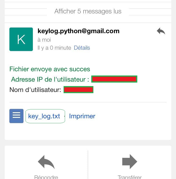 Dans la boite de récéption,vous allez trouver les fichiers key_log.txt avec quelques informations sur l'utilisateur comme l'adresse IP et le nom d'utilisateur.