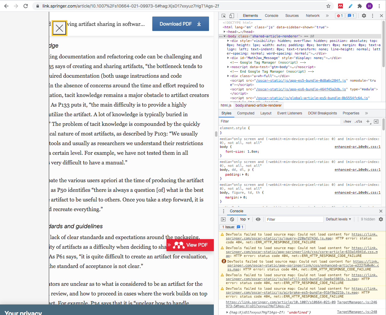 Create annotations using Highlight&Go over a springer paper (https://doi.org/10.1007/s10664-021-09973-5). Then reload extractor view and try to open the document following the evidence link (ending in hag:...).