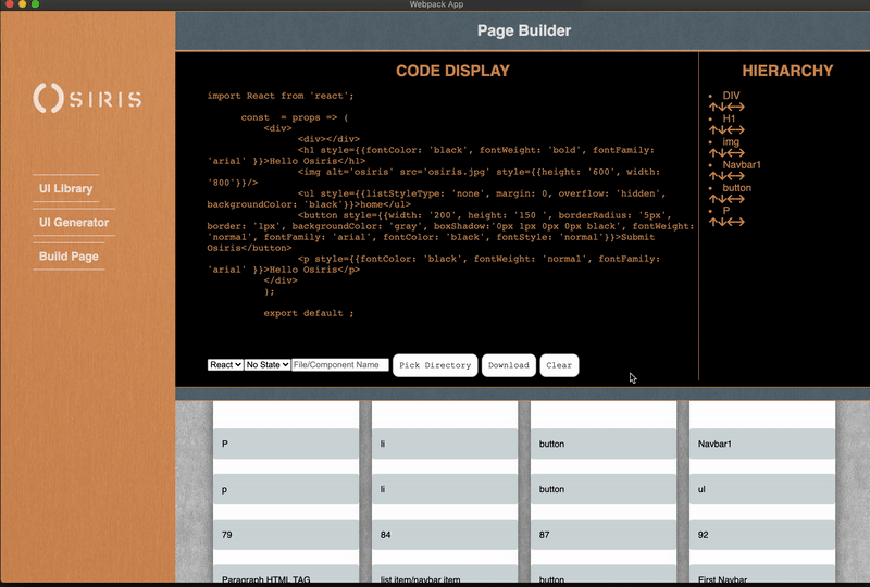 Osiris is an all-in-one UI Component Library + Generator + Page Builder for developers and designers. Create and store custom, reusable components in React or Vue. Then, dynamically inject the components and manipulate their hierarchy. Finally, download the code for further development.