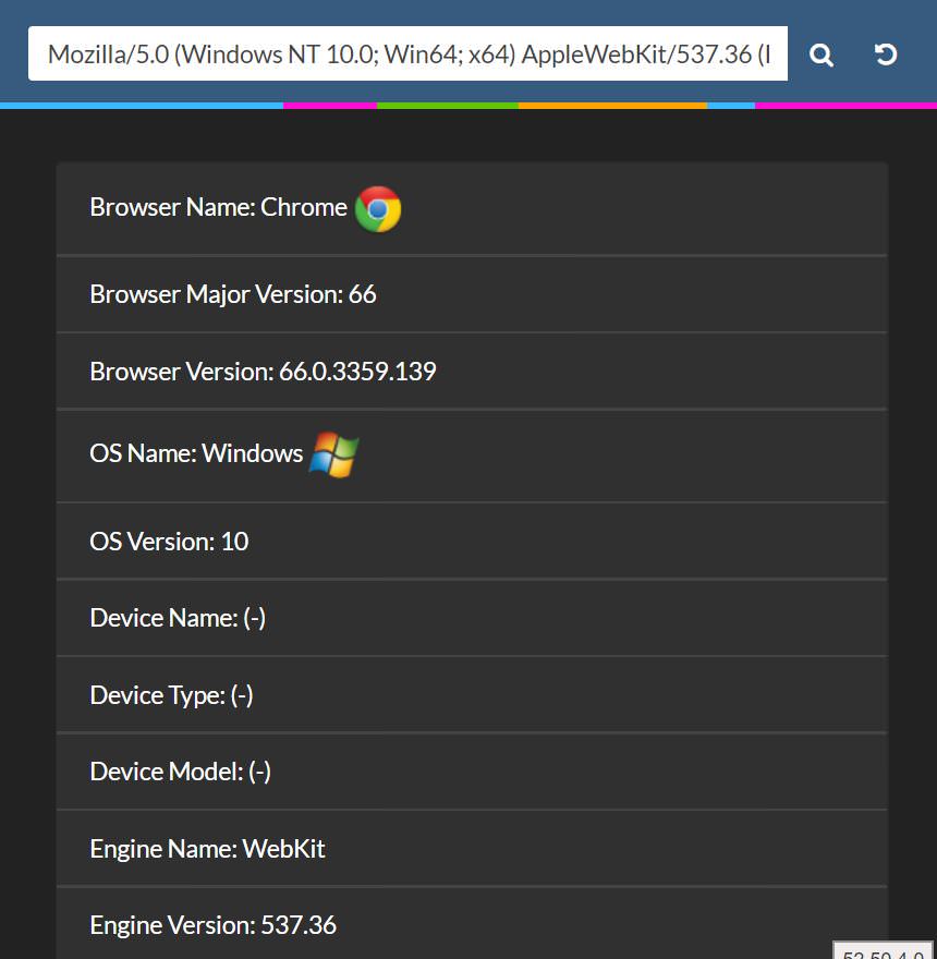 The following tool lets you enter a user agent string and it will identifiy your browser, engine, OS, CPU, and device type/model using a third-party library named UAParser.js