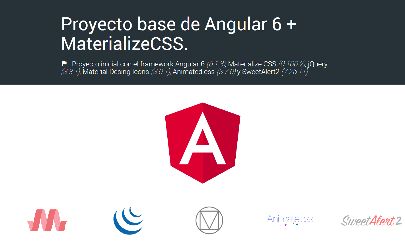 Proyecto inicial de Angular 6 + MaterializeCSS + jQuery + Material Design Icons + SweetAlert2 + Animated.css