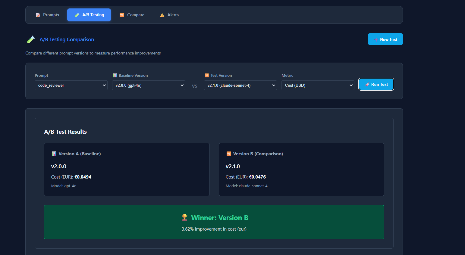 Model Comparison: Test the same prompt across different models (GPT-4, Claude, Gemini, etc.) and see aggregated metrics with automatic identification of the fastest, cheapest, and highest-quality model.