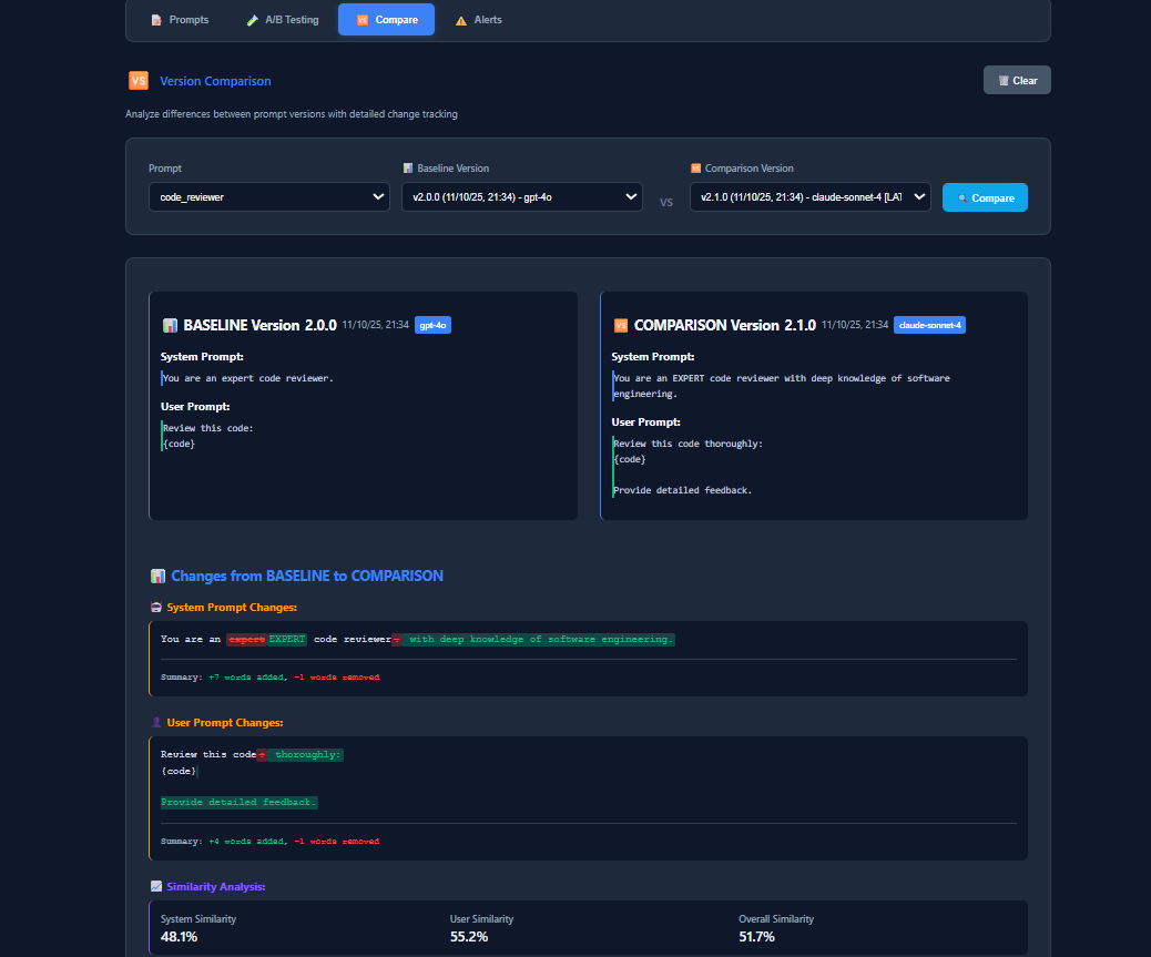 Created first prompt version 1.0.0!")- Version history with visual diff