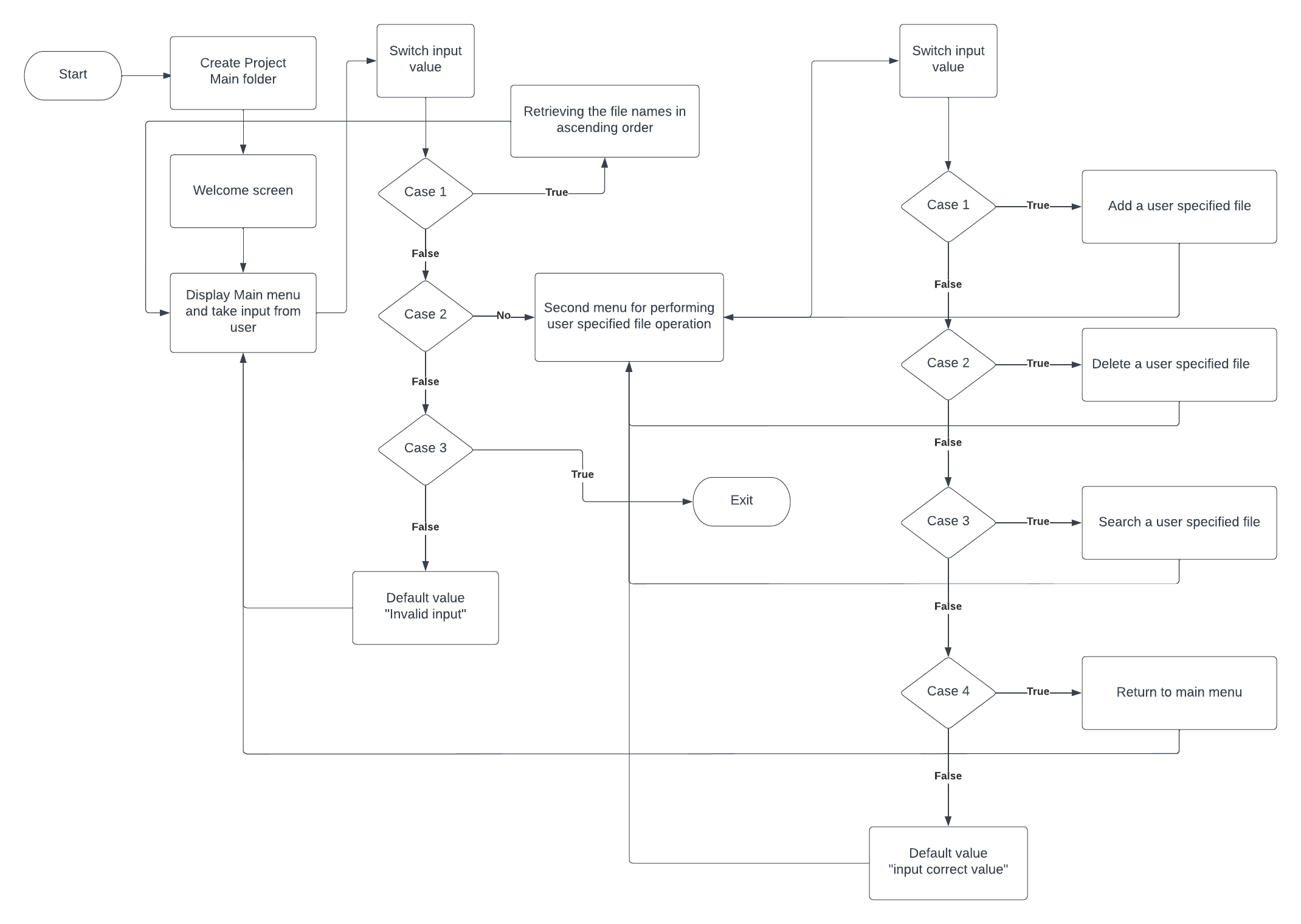 The user is able to seamlessly switch between options or return to previous menu even after any required operation like adding, searching, deleting or retrieving of files is performed.