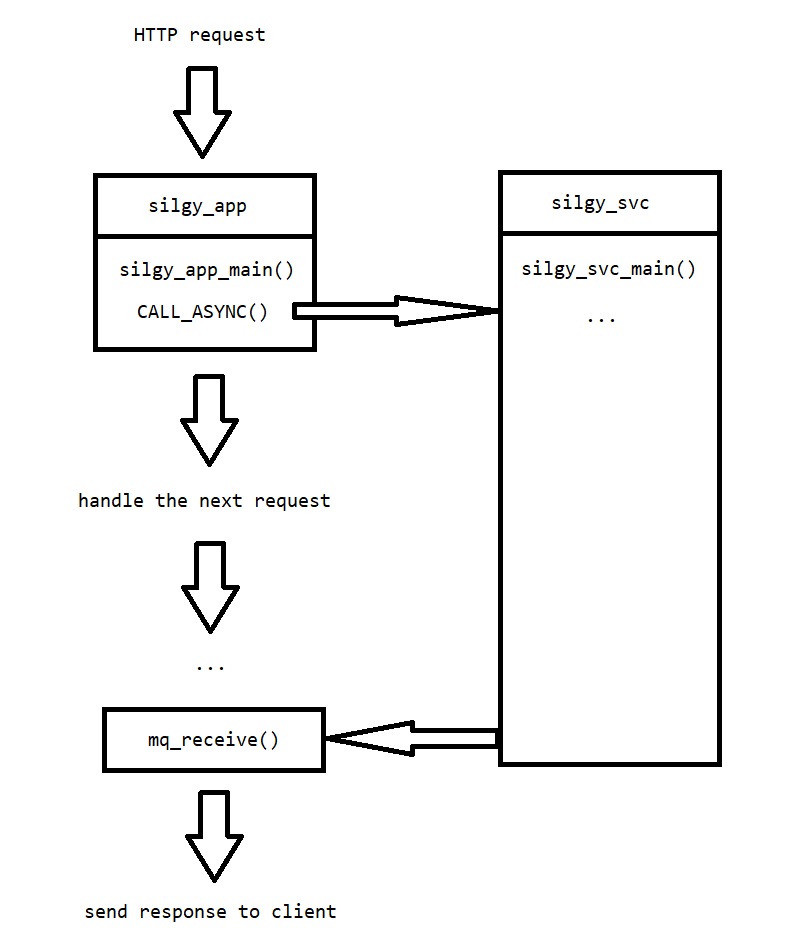 To solve this, we need some kind of parallel processing. It can either be multithreading or multiprocessing. Node++ uses multiprocessing. Communication between processess is realized via standard POSIX message queues. Apart from convenient data exchange, message queues provide natural load balancing: the first npp_svc process that is able to receive the message, atomically removes it from the queue. CALL_ASYNC macros prepare the request, call mq_send and return without blocking of the main thread. The remaining part of the application logic will be executed by npp_svc. After calling CALL_ASYNC, npp_app process continues serving incoming requests and with every loop pass will check the response message queue whether npp_svc call has returned. When it has, it will write the response back to the client: