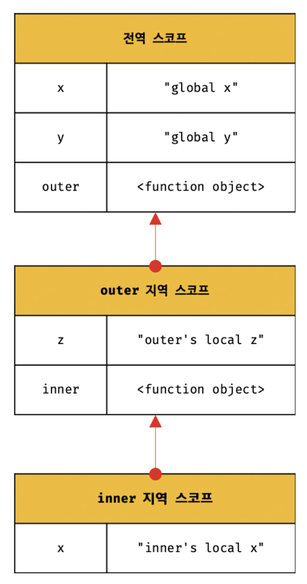 - 함수는 중첩될 수 있으므로 함수의 지역 스코프도 중첩될 수 있다 → 스코프가 함수의 중첩에 의해 계층적 구조를 갖는다