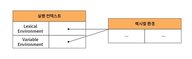 LexicalEnvironment 컴포넌트와VariableEnvironment 컴포넌트로 구성 - 생성 초기에는 하나의 동일한 렉시컬 환경을 참조, 이후 몇가지 상황을 만나면 각자가 새로운 렉시컬 환경을 생성하여 내용이 달라지는 경우가 있다.