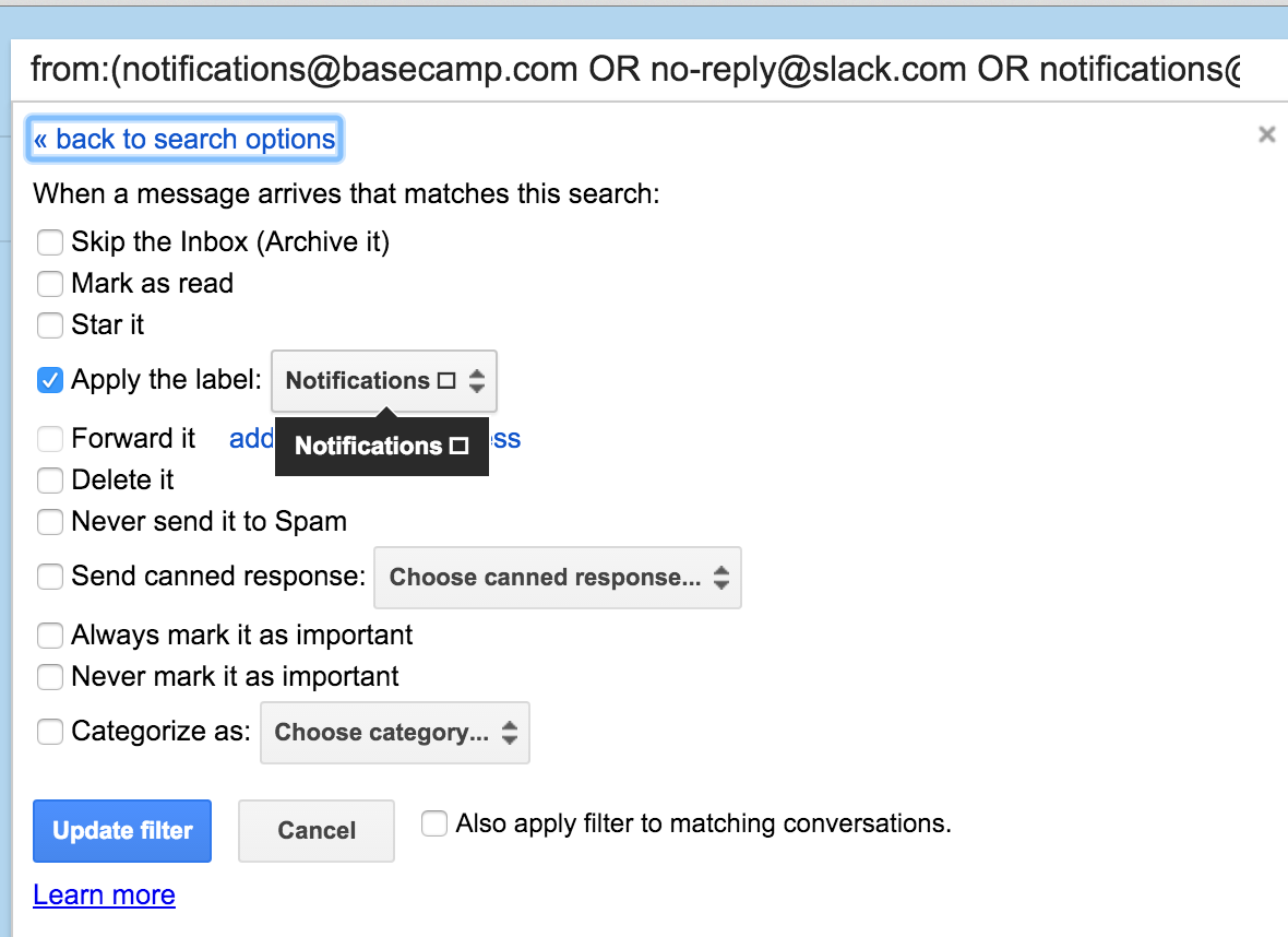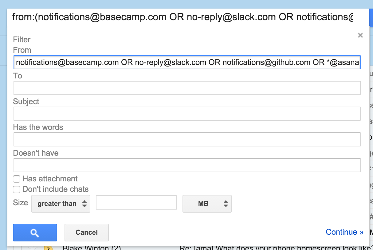 Example: notifications@basecamp.com OR no-reply@slack.com OR notifications@github.com OR *@asana.com