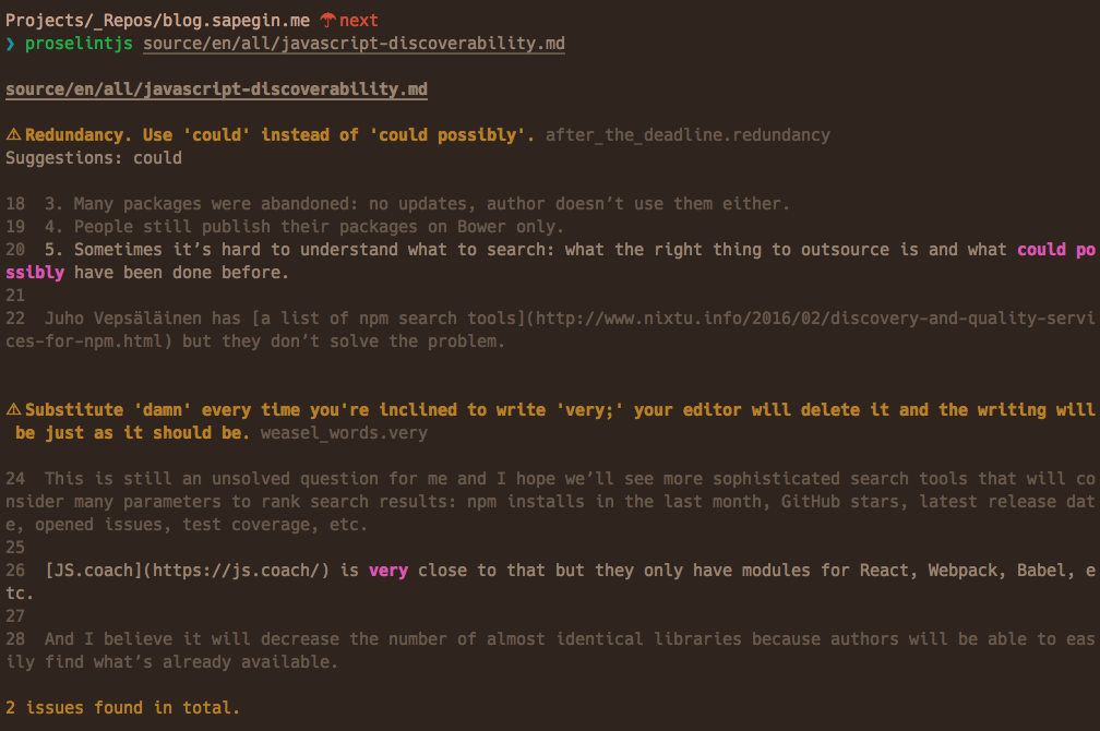 Proselint wrapper with a friendly reporter. Also skips text in Markdown code blocks.