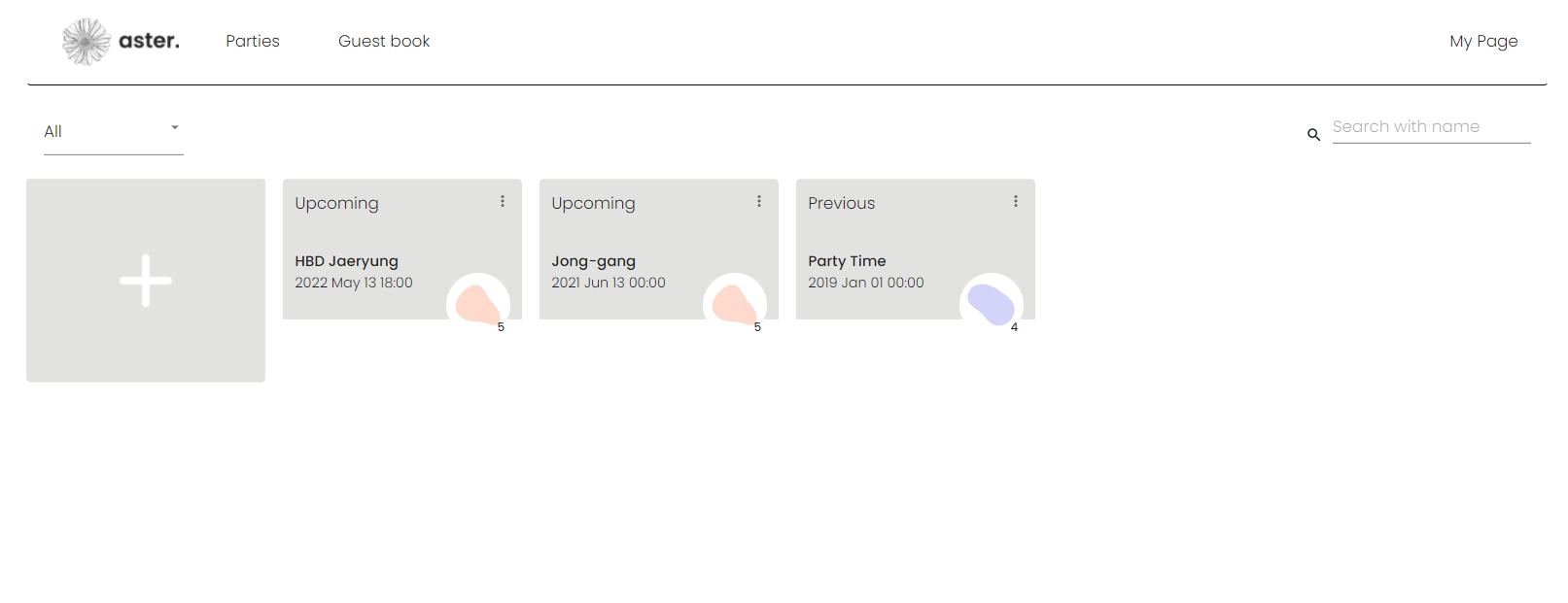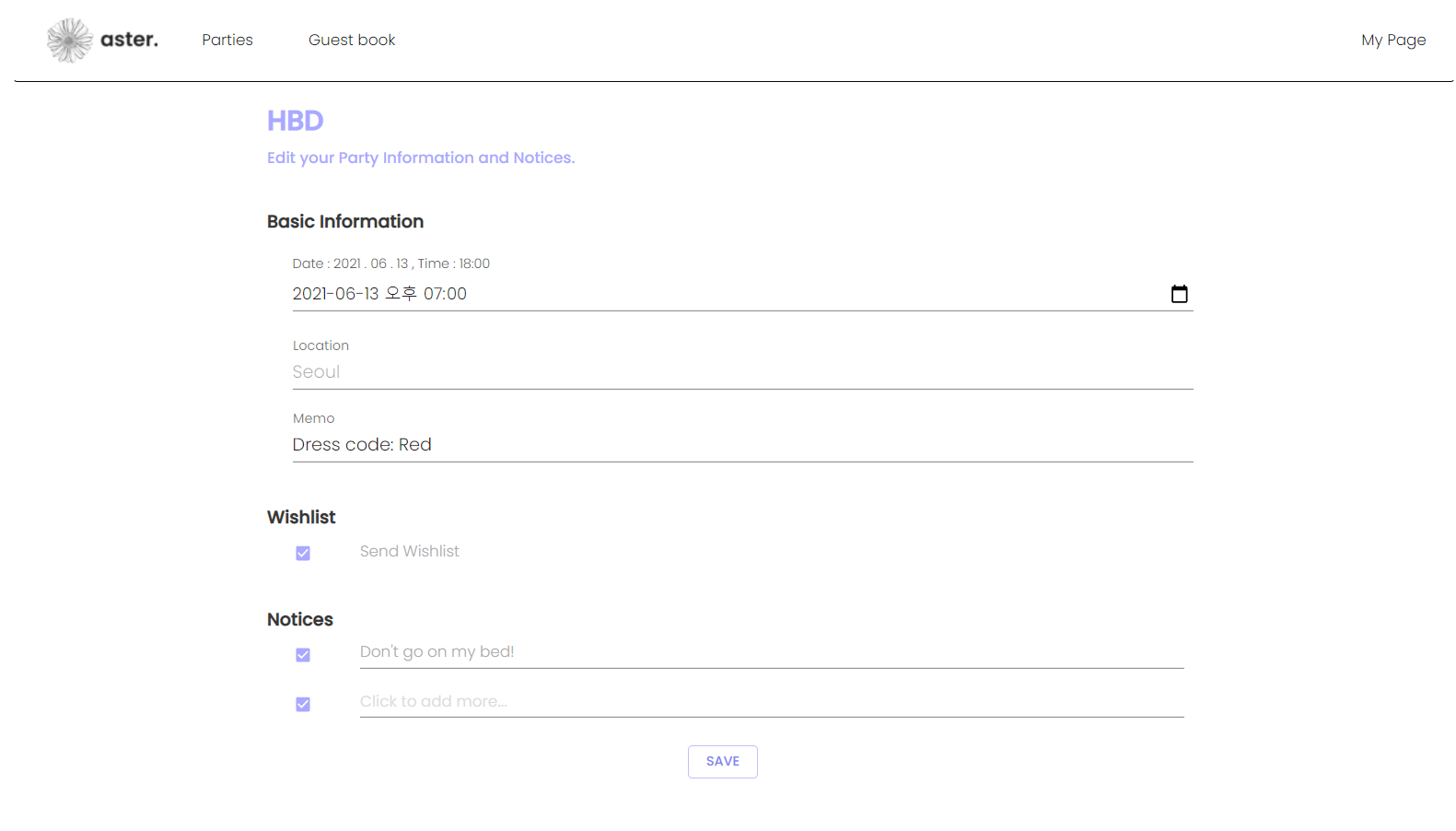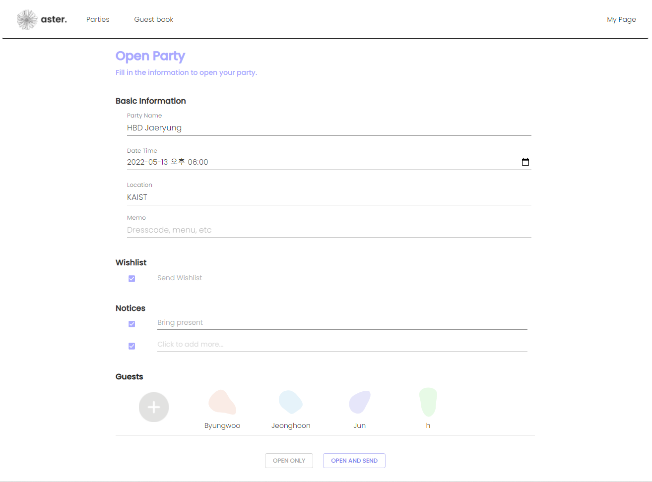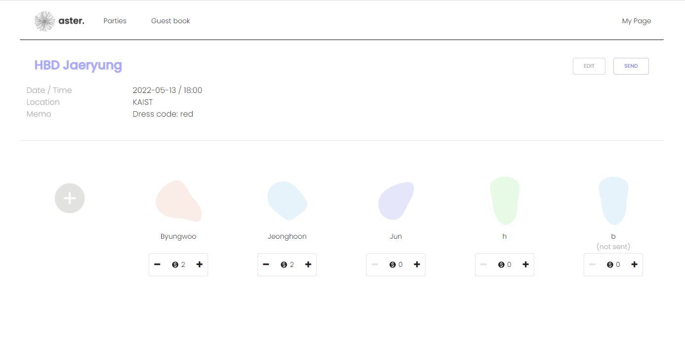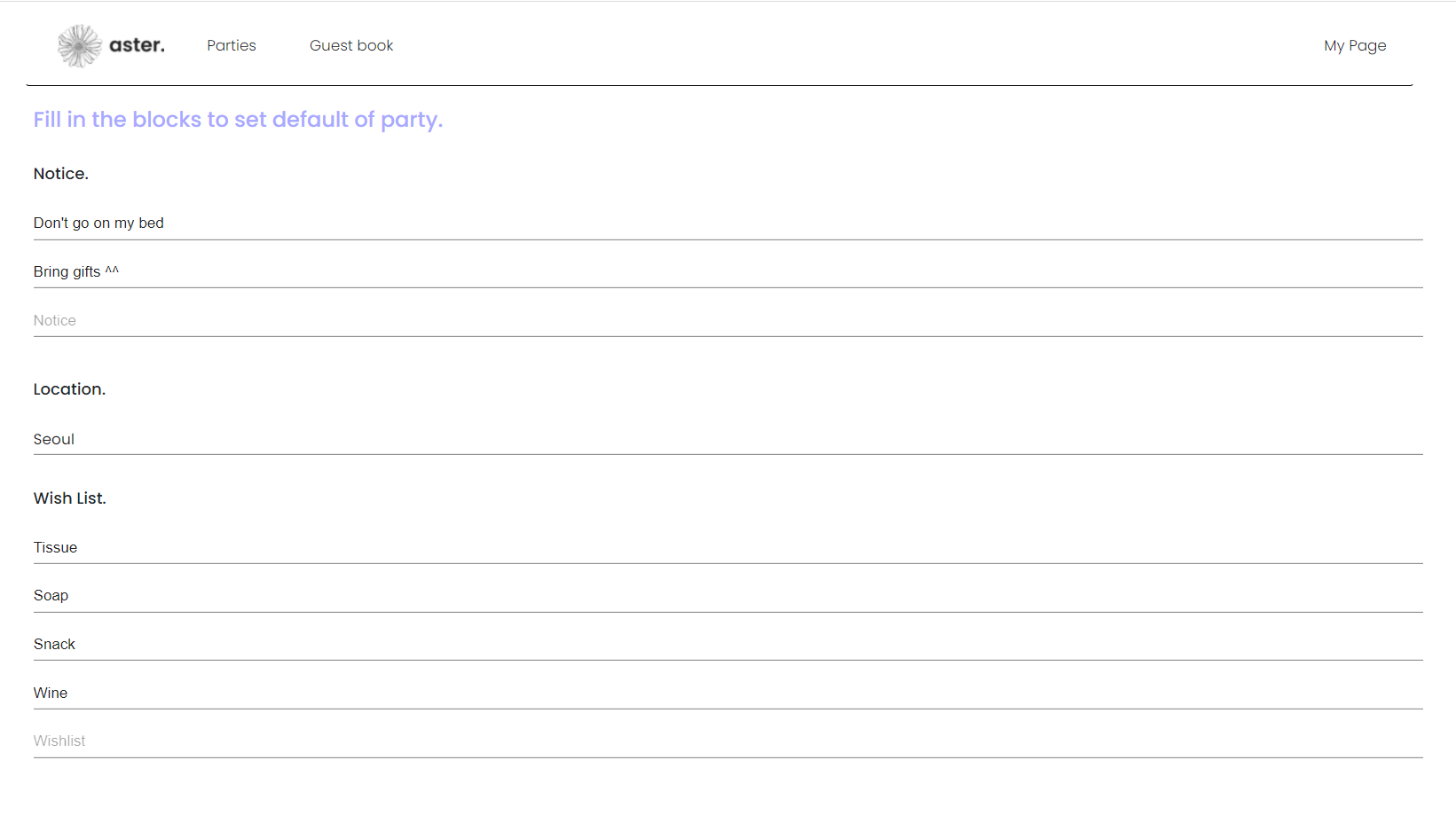 - Navigator header, where you can go to ‘home’, ‘parties’, ‘guests’, and ‘mypage’