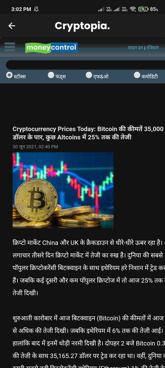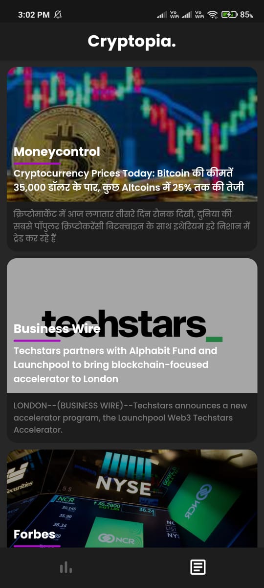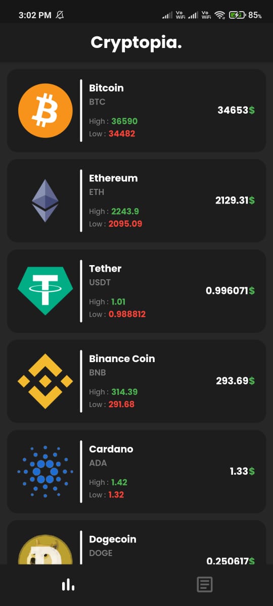 Cryptopia An app which tracks Cryptocurrency Price and also Provides with the latest news to the related to the topic. Main Feature's WebView Widget Made Using 2 API's (coingecko & NewsApi) Bottom Navigation Bar ScreenShot's