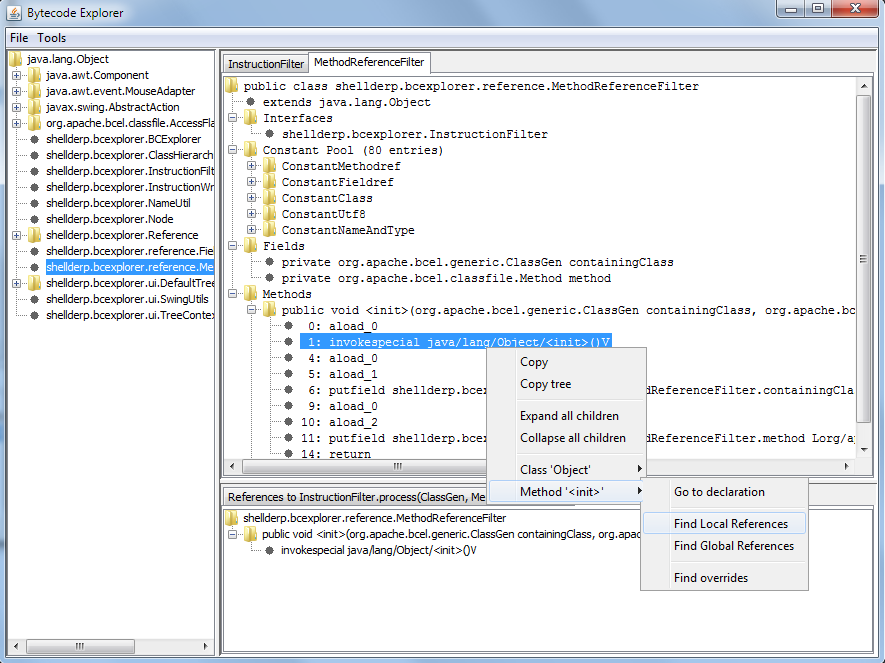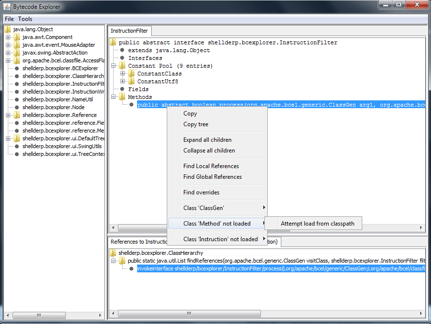 Bytecode Explorer is a graphical tool that loads Java classes and provides an interface for bytecode exploration. Many features are similar to what most Java IDE's offer (reference searching, etc.). This project started as result of needing better tools for reverse engineering Java applications.