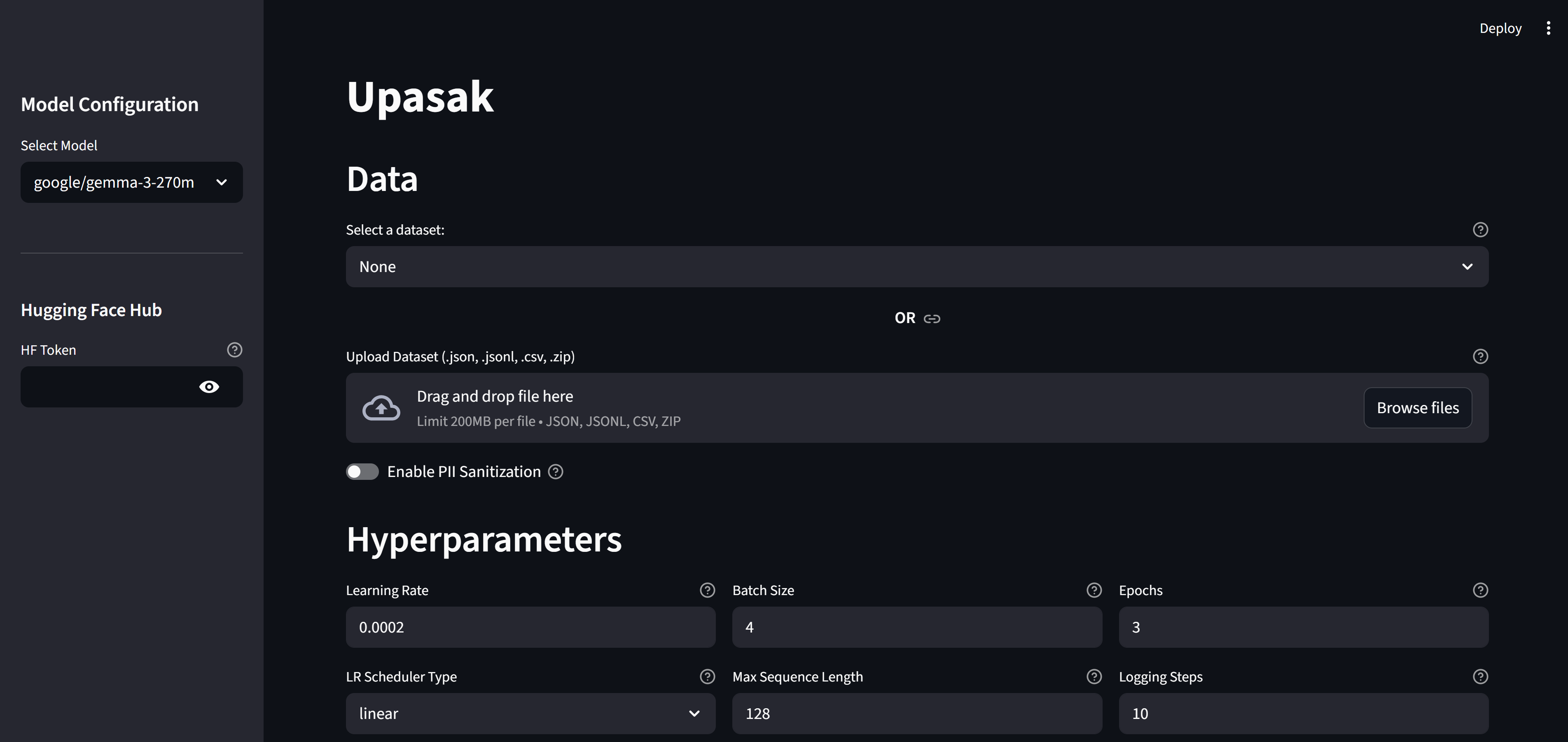 Upasak is a flexible, mindful to privacy, no-code/low-code framework for fine-tuning large language models, built around Hugging Face Transformers. It features an easy-to-use Streamlit-based interface, multi-format dataset support, built-in PII and sensitive information sanitization, and a customizable training process. Whether you're experimenting, researching, or performing internal fine-tuning tasks, Upasak makes it easily accessible and compliant.