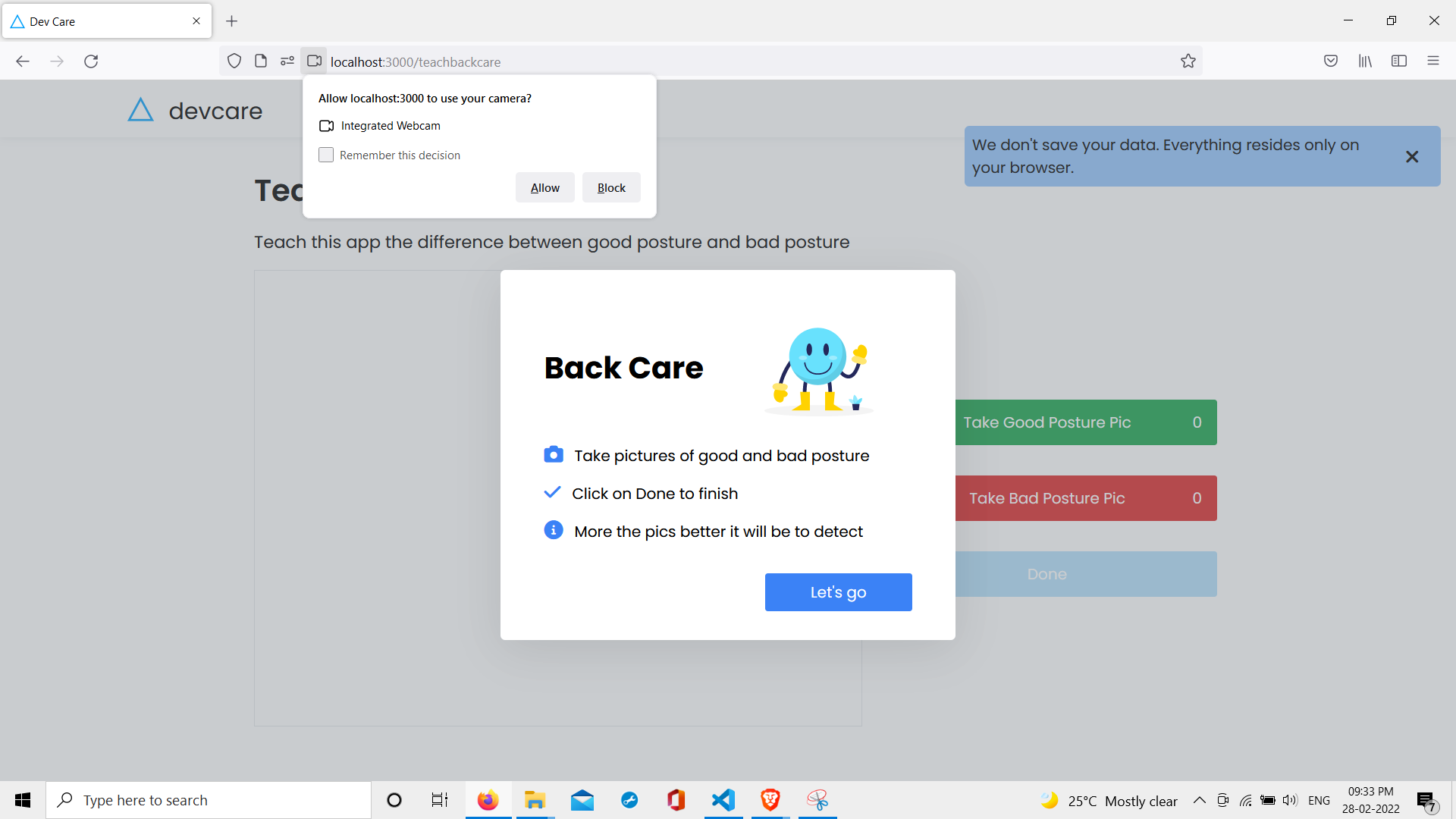 The app first needs to understand what a good posture is and what a bad posture is. For that, you’ll need to click at least 10 pictures for both cases. The app will learn from those images what a correct and incorrect posture is. After which, at regular intervals, the app will be able to check your posture and further inform you if it is not correct.