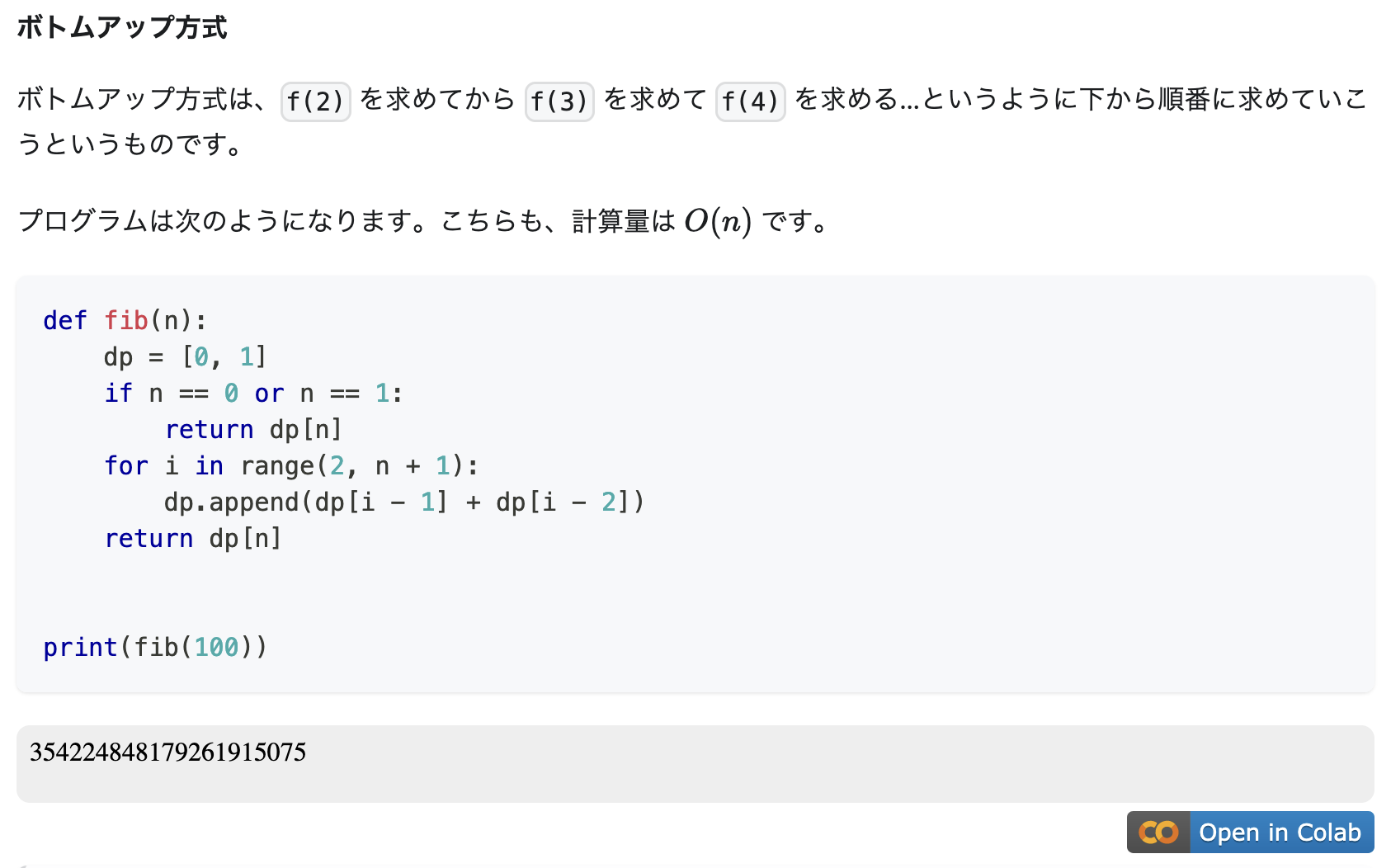 <img width="843" alt="image" src="https://user-images.githubusercontent.com/104971044/235332477-9ed9c5fc-a76d-46b1-a778-bcd3dd925a29.png"> この問題の ```python if n == 0 or n == 1: return dp[n] ``` は不要ではないか。