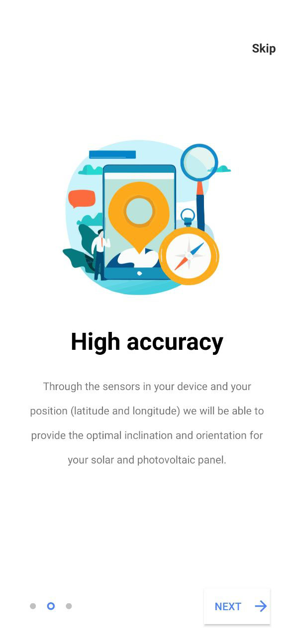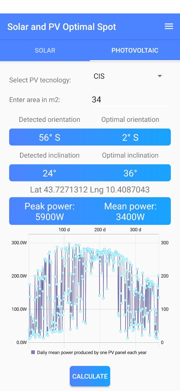 The application, through API given by PVGIS, guides the user to the reading of the big amount of data gives by the online software calculator focusing on optimal inclination and optimal orientation. These two values described perfectly the positioning of the user solar and PV panel. In addition, the app shows the user daily mean data of irradiance and power through smart graphs refering to 2013. All these data can be used even for scientific and engineering analysis and can be obtained very quiclky through the simple and the optimized app design. Features: