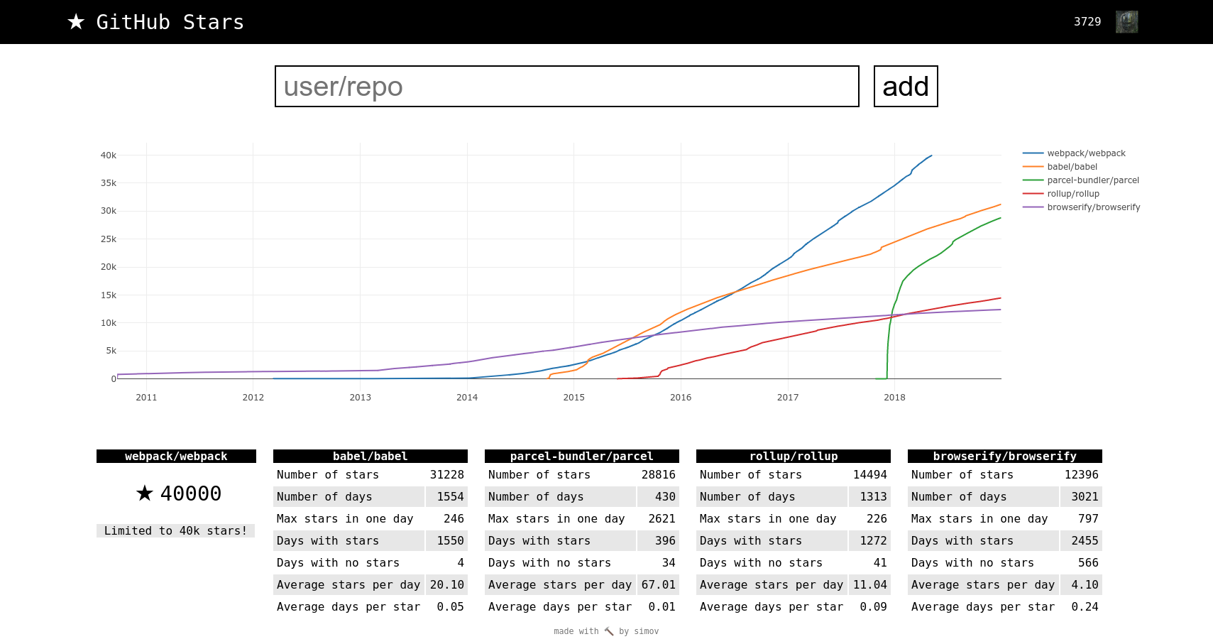 npm run render:prodCurrently the GitHub API have a hard limit of up to 400 pages returned for stargazers history for a given repository, meaning that only the first 40k stars can be explored with this app.
