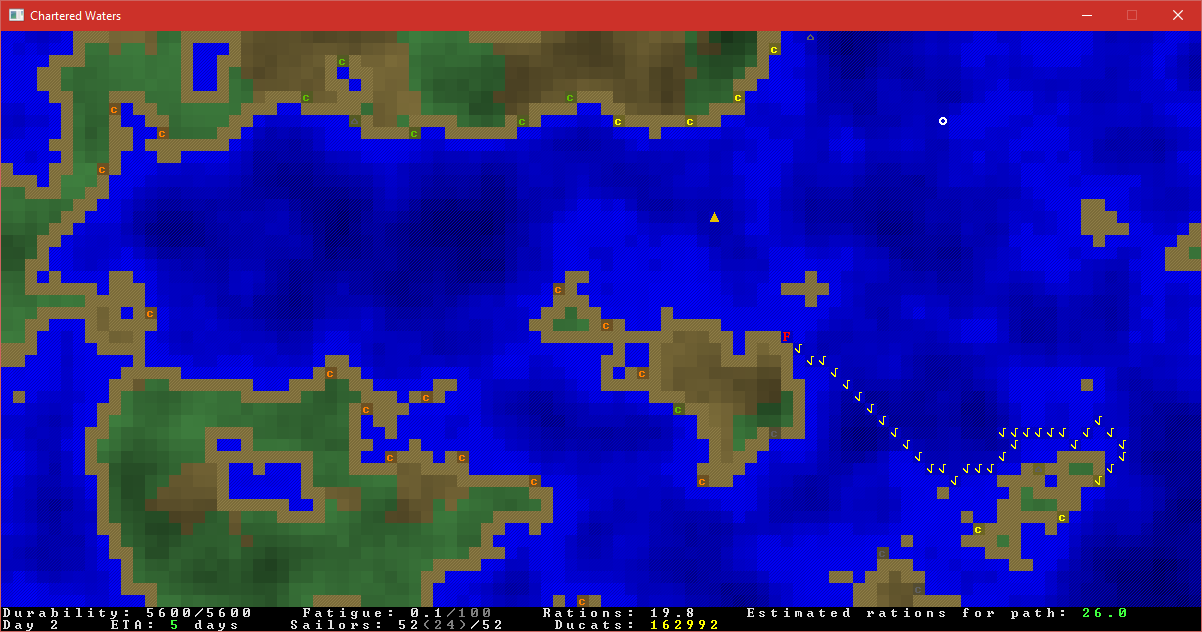 Chartered Waters is a procedurally generated game set in a fictional Age of Sail. Heavily inspired by the game series Uncharted Waters, and in particular Great Age of Sail Online, the aim of the project was to create a world with a living economy and agents acting as merchants capable of making informed decisions, painting a backdrop on which the player could make her decisions and affect the economy.
