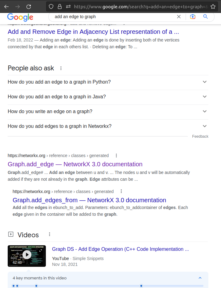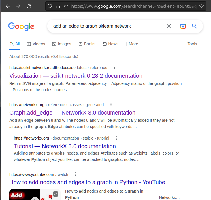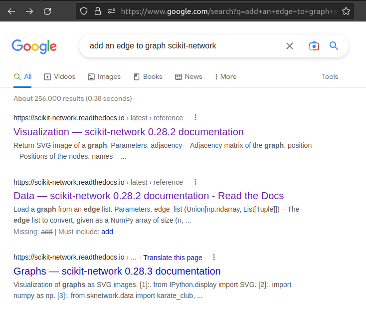 what I was looking forI wanted to use the graph to analyze the sensors logs of trains. I needed to iterate on my tabular data to and by my customize function, add nodes, and link to my graph. So I was looking for a method that enabled me to add edge with more control. And this is my google search for the tutorial that I was looking for Google search1. This is when I google in a general way;2- Then I tried to be more specified:The result is general documentation on visualization, different from what I looked for, and then documentation from another library. 3- Again, I tried to be more specific on the library:What I found:The More related document that I found was this https://scikit-network.readthedocs.io/en/latest/tutorials/data/load_data.html What I would love to see in the documentationA better SEOEven if there was enough documentation, if those would not indexed by search engines, we could not find them. Documents that are not indexed in google ( or other search engines) are like they don't exist. A conceptual manifestoI tried to understand the logic behind the library's abstraction, but it needs to be more explicit. A manifesto/whitepaper that explains the logic of abstraction and the conceptual framework of this library will be really helpful. Multy level of documentation.The actual documentation helped me to understand that we could do everything possible with another framework with this framework. However, if I could have complete use cases both in a simple but low-level and more complex more significant project more in high level. Also, thank you for your reactiveness and open ness to feedback |