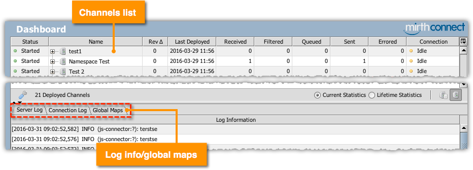 Users manage and develop channels (message pathways) using the interface known as the Administrator: Administrator screenshot