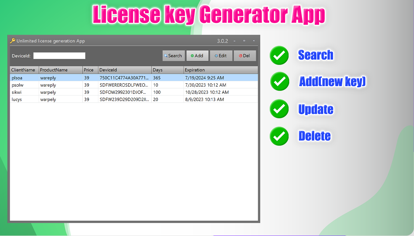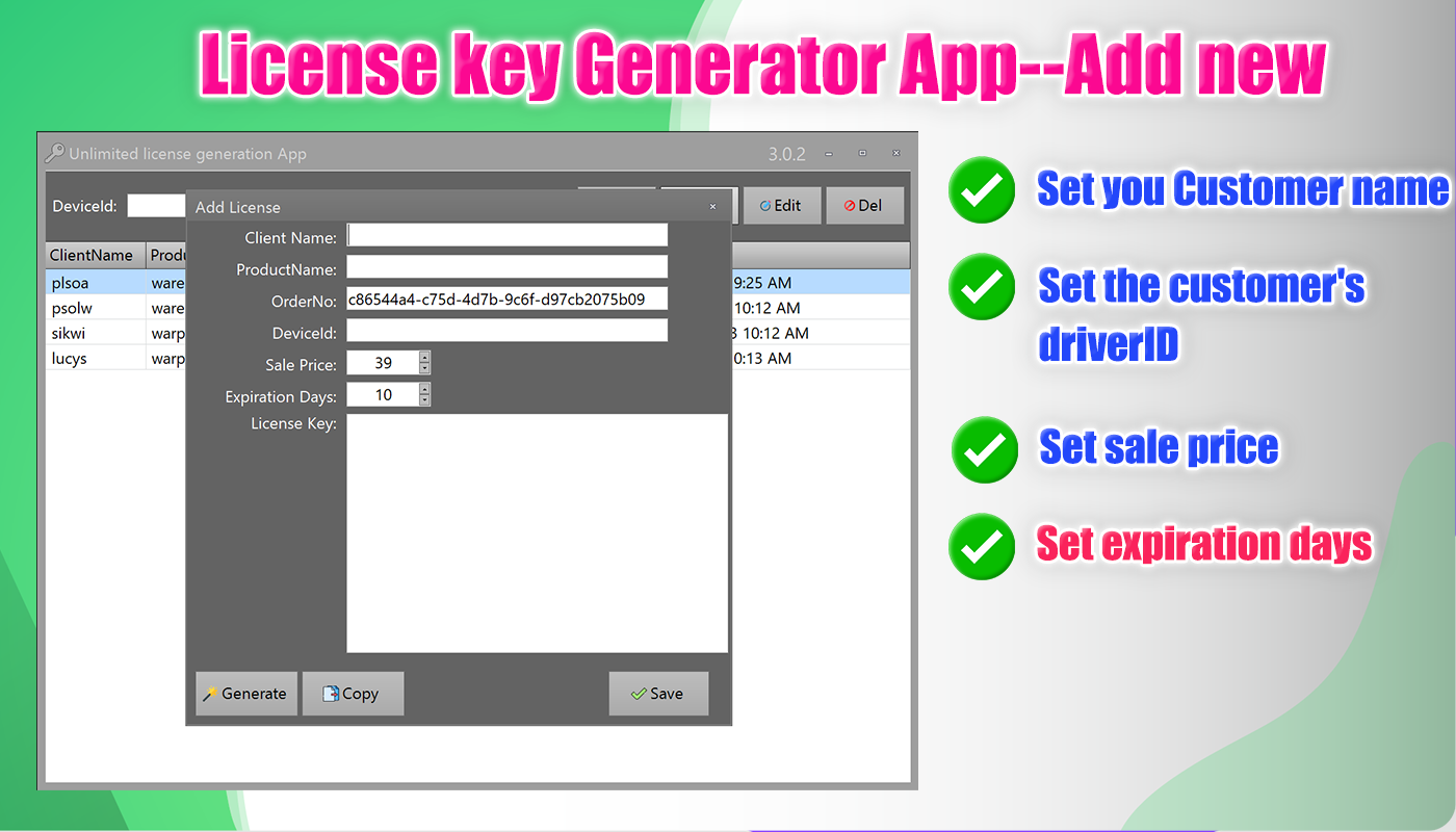 With "Unlimited License Key Generator App" you can sell unlimitedly to any customer.