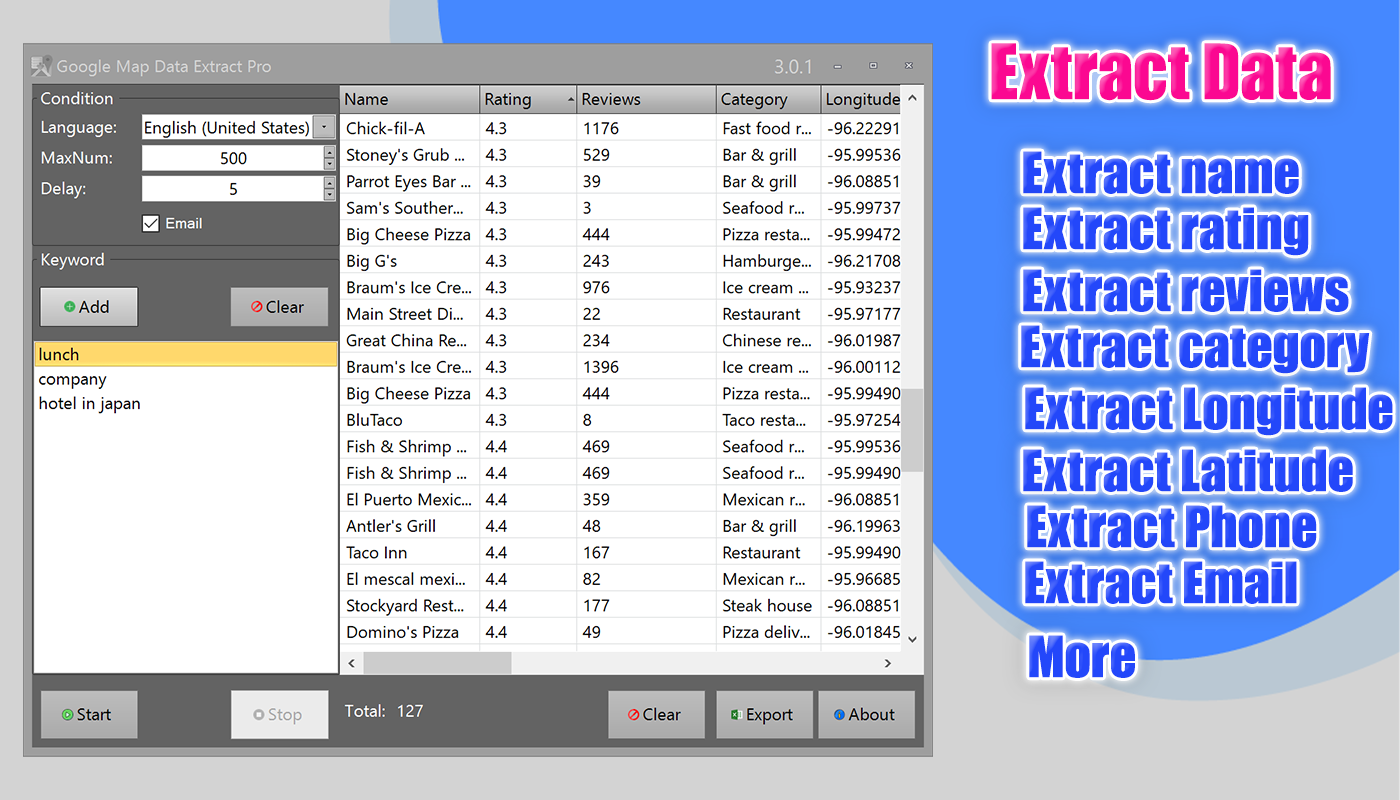 ✅ All languages supported - you can choose any specified display language ✅ Easily extract Business Name ✅ Easily extract Rating ✅ Easily extract Longitude ✅ Easily extract Latitude ✅ Easily extract Phone ✅ Easily extract Email ✅ Easily extract Address ✅ Easily extract WebSite ✅ Easily extract PlusCode ✅ Multi-thread extract Email ✅ Easily extract Facebook ✅ Easily extract Instagram ✅ Easily extract LinkedIn ✅ Easily extract Twitter