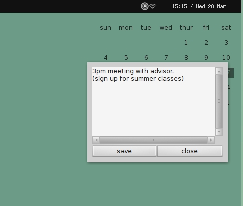 What A simple, interactive, conky-like calendar. Can store notes on each day. Screenshot Dependencies Gtk A composite manager such as xcompmgr (for transparency. not a must)
