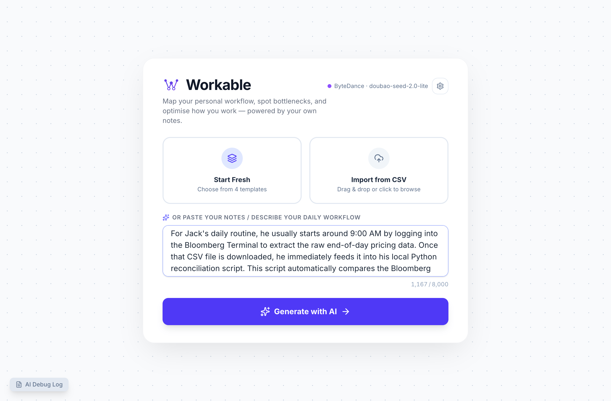 Workable is a personal workflow engine that uses AI to transform plain-English descriptions into structured, interactive process maps. Spot bottlenecks, organise tasks, and optimise your daily routines — all in one unified canvas.