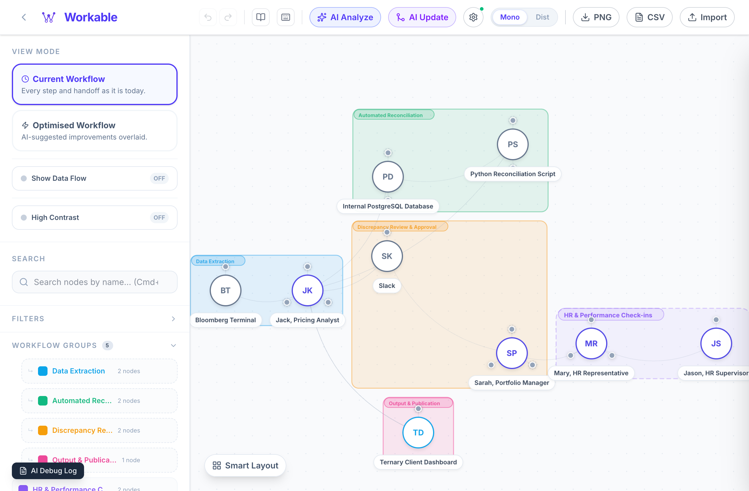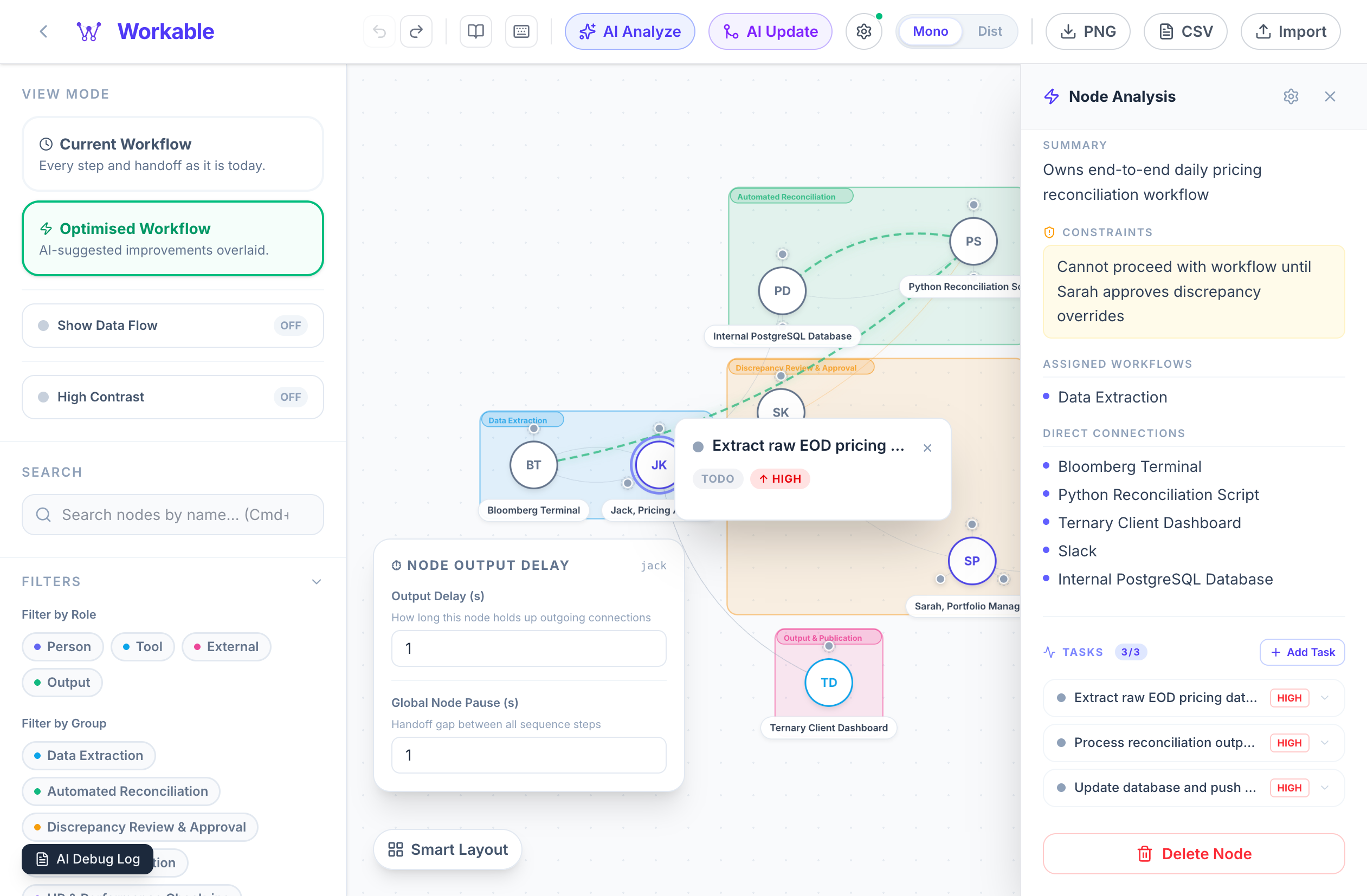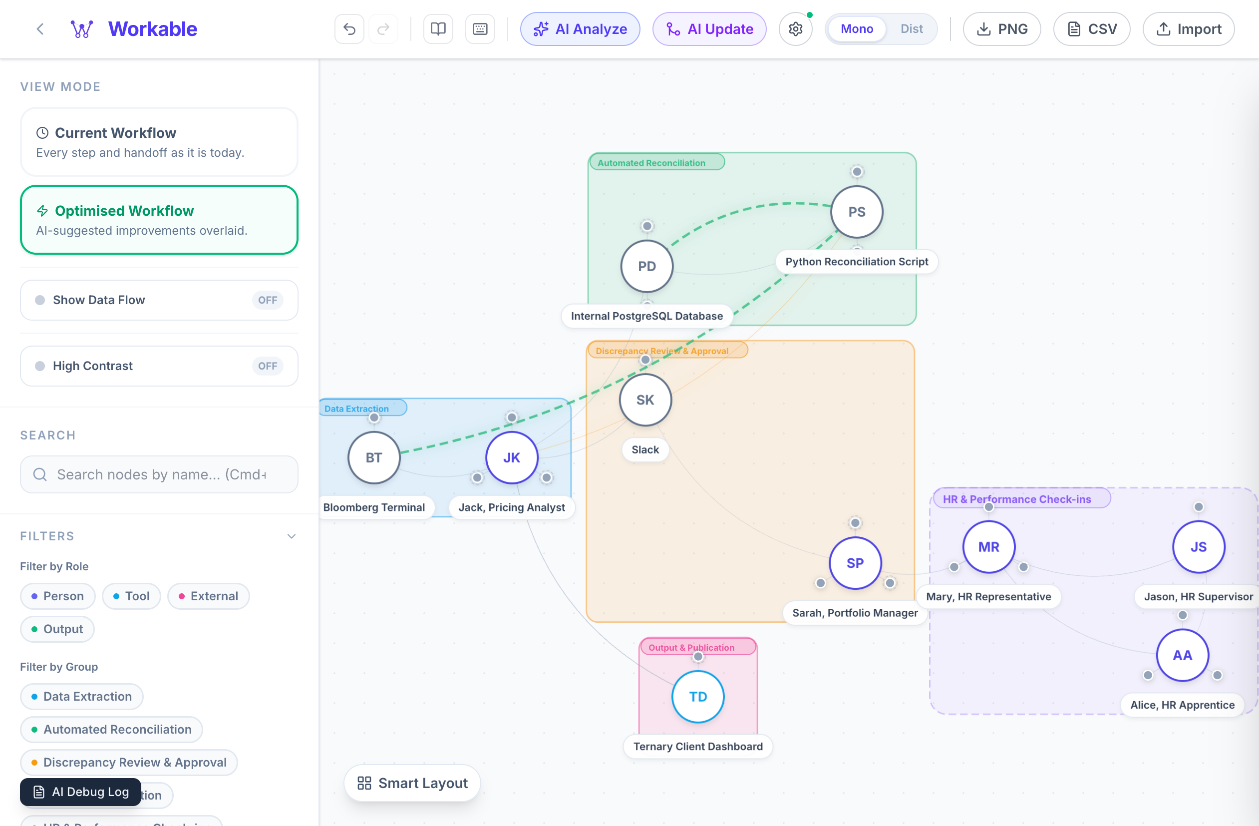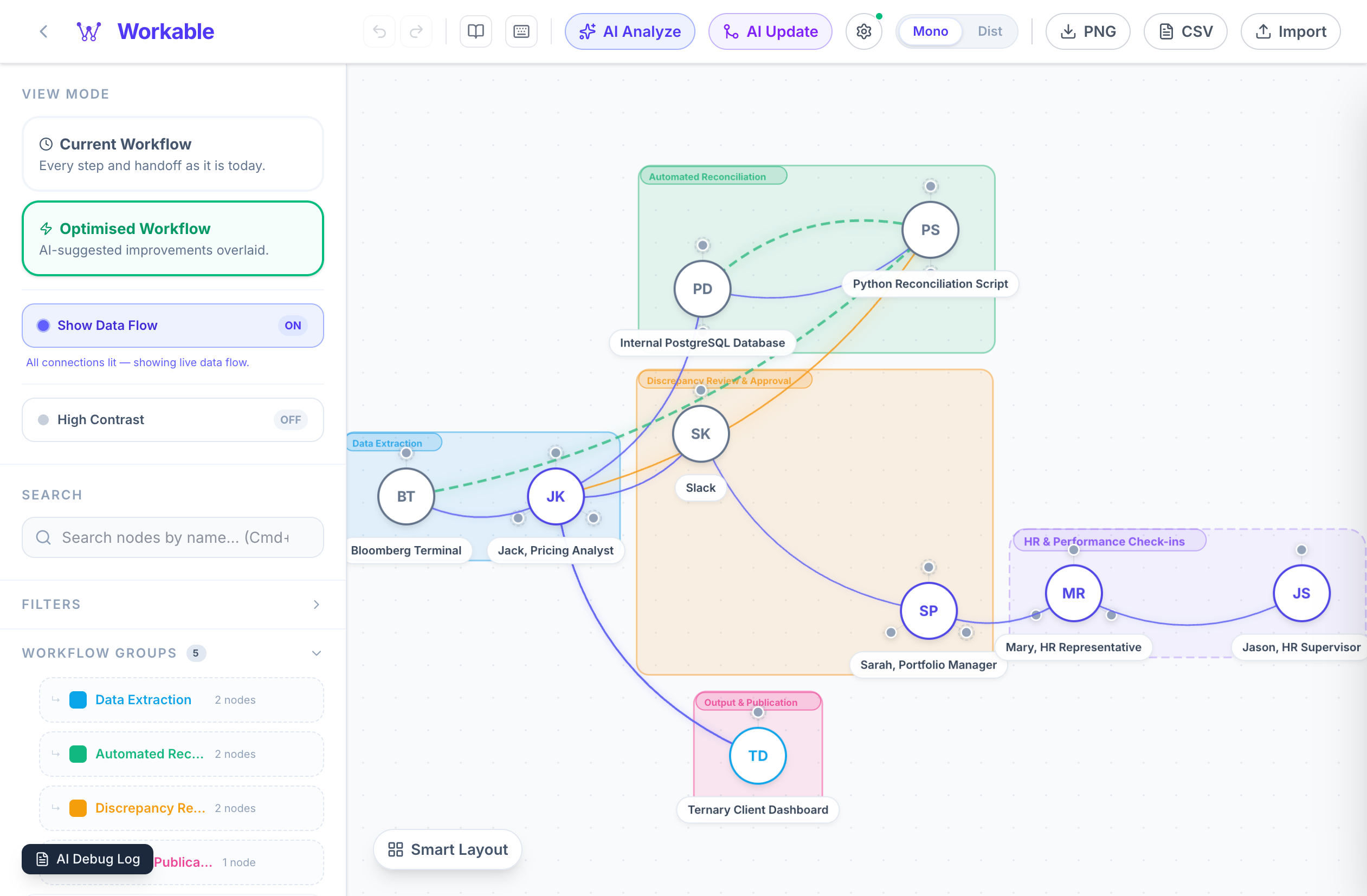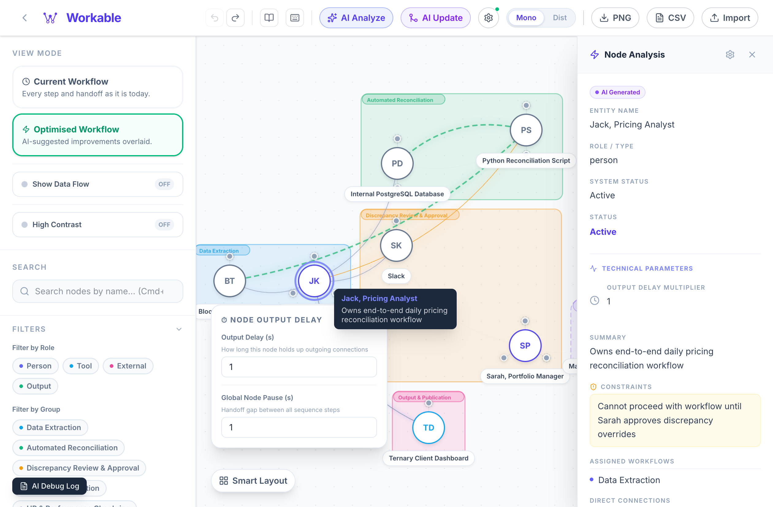 Toggle between the Current Workflow and Optimised Workflow to see AI-suggested improvements overlaid on your canvas.
