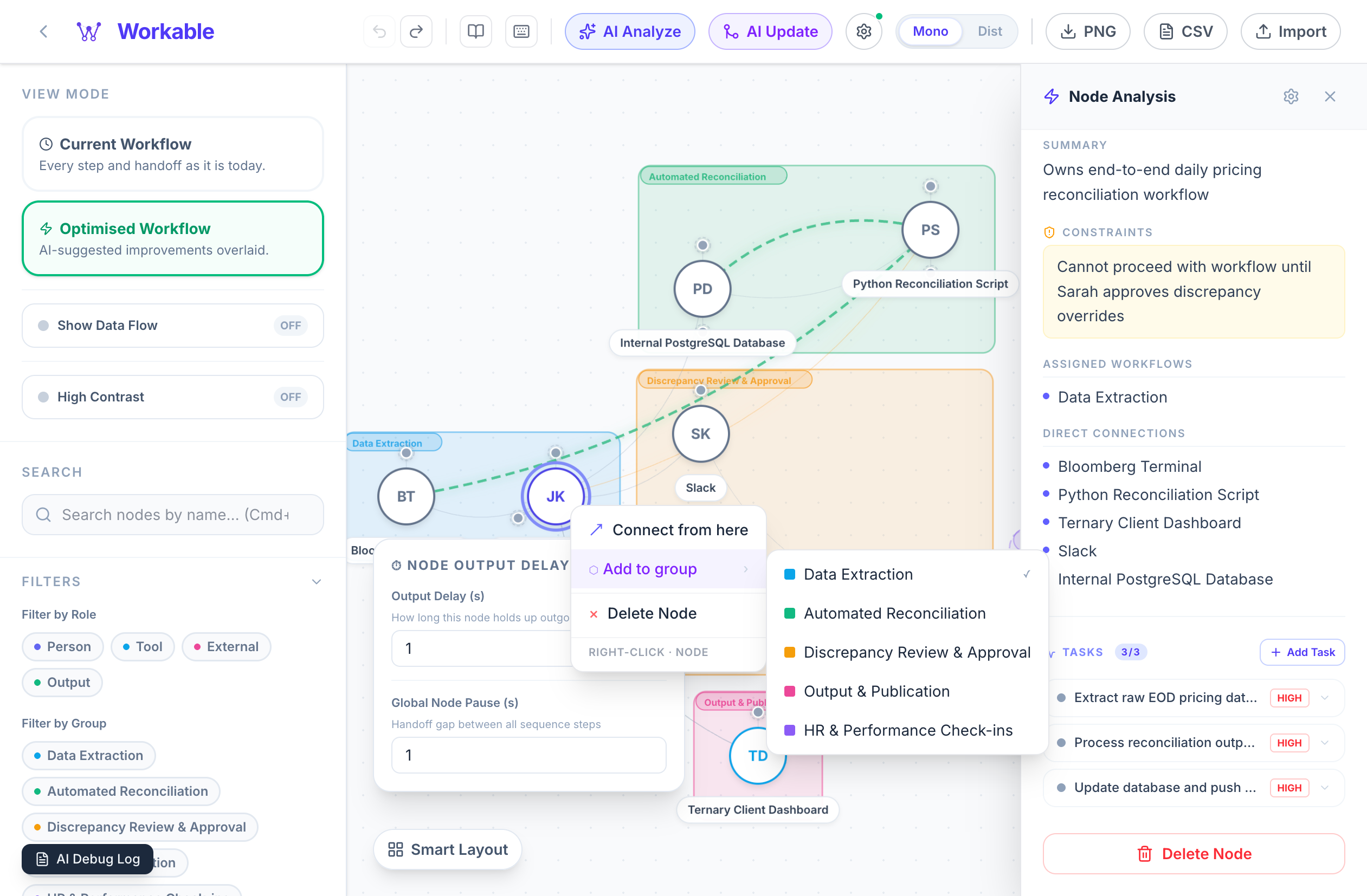 Right-click any node to set output delay, assign it to workflow groups, add manual connections, or delete it.