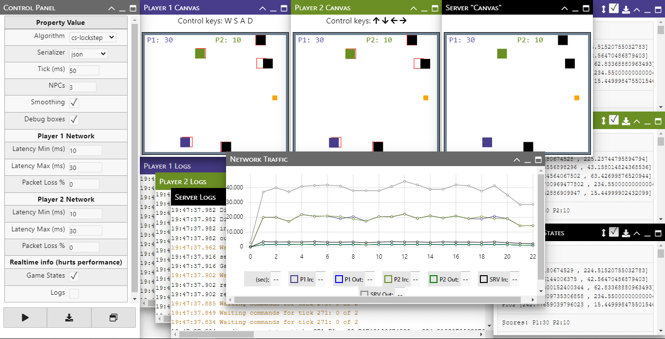 - p2p-rollback: each node maintains a history of game states. When a command that belongs to an old state arrives, the history is recalculated from that state on. Each node sends commands only when it changes value, not on every tick.